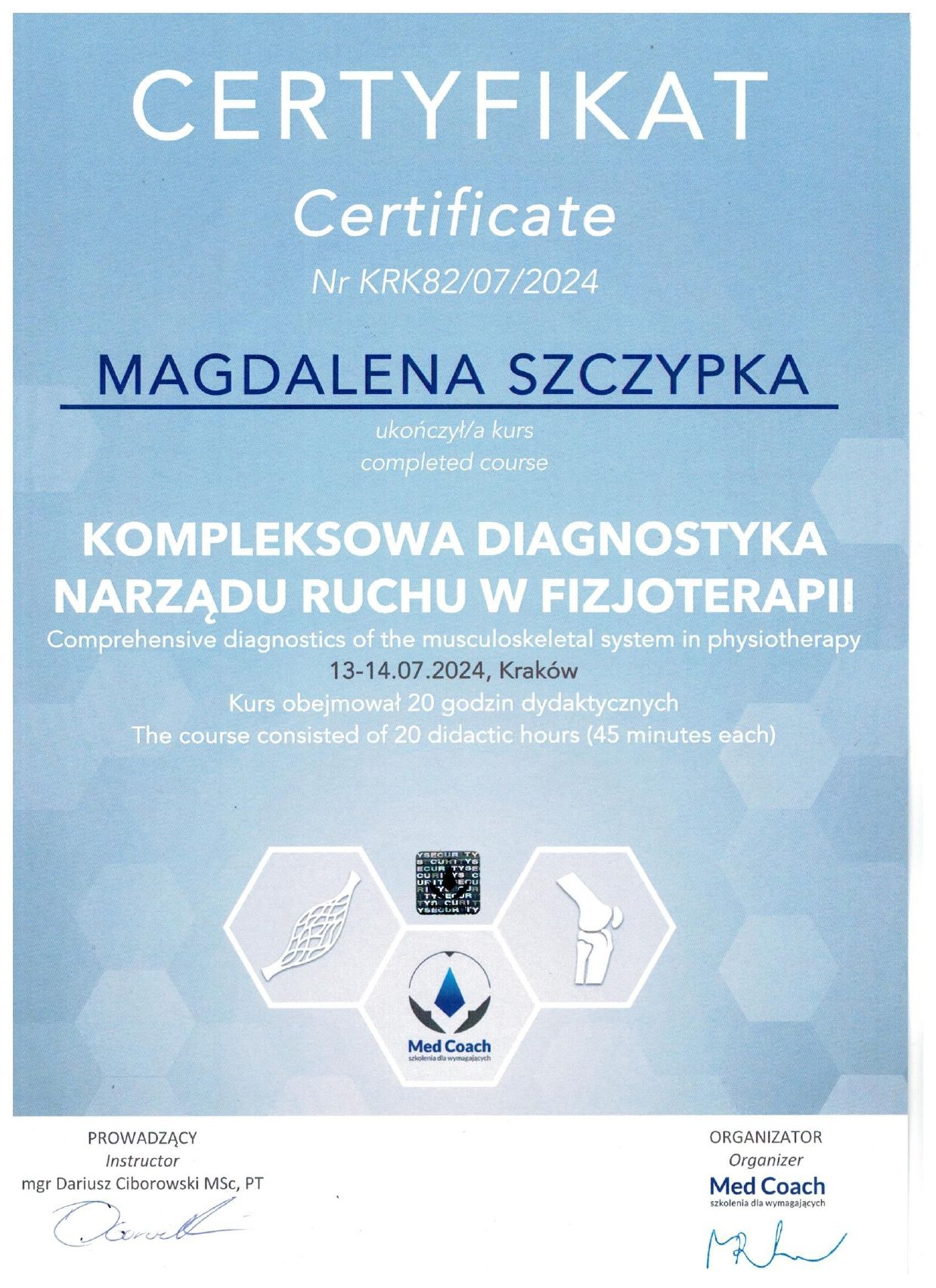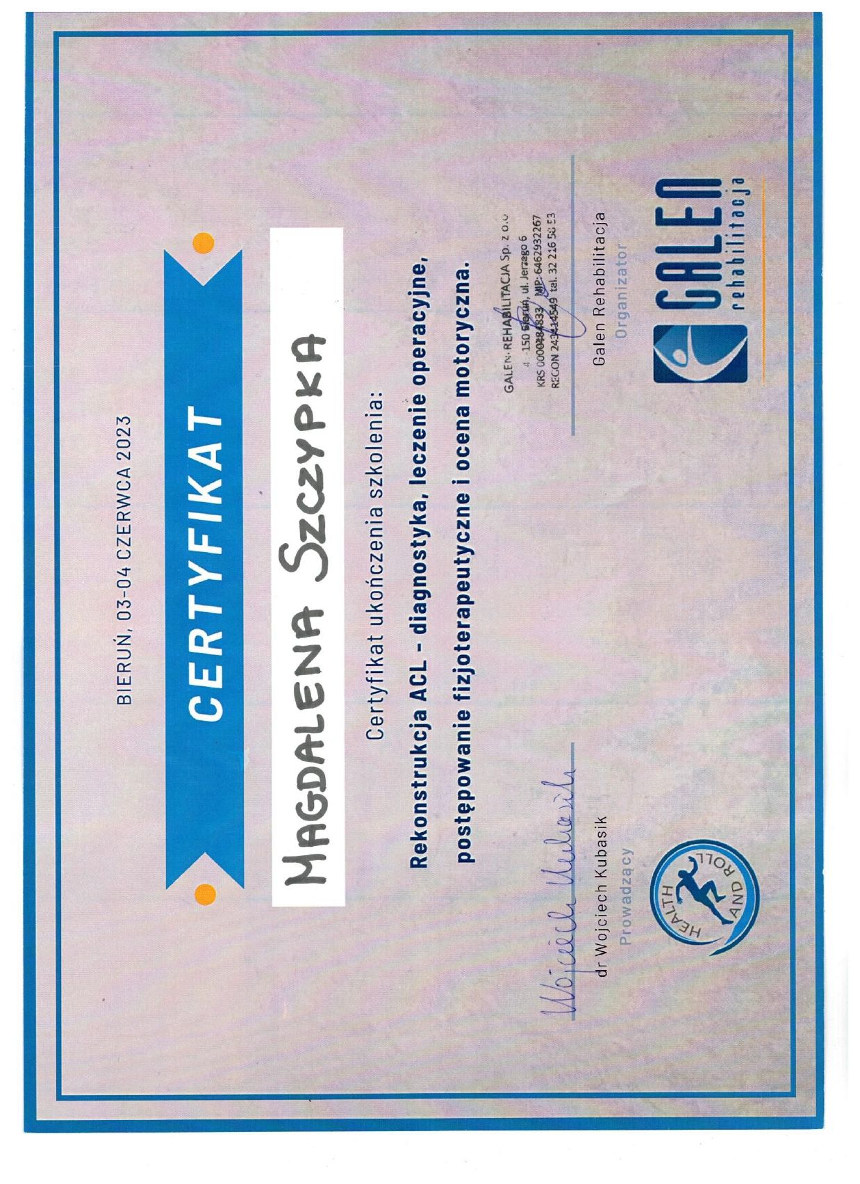 Łączę terapię manualną (w trakcie szkolenia MT I wg IFOMPT) z indywidualnie dobranym treningiem funkcjonalnym, siłowym. W pracy wykorzystuję nowoczesne technologie diagnostyczne oraz stale poszerzam wiedzę, uczestnicząc w licznych kursach z zakresu terapii, treningu i analizy ruchu.