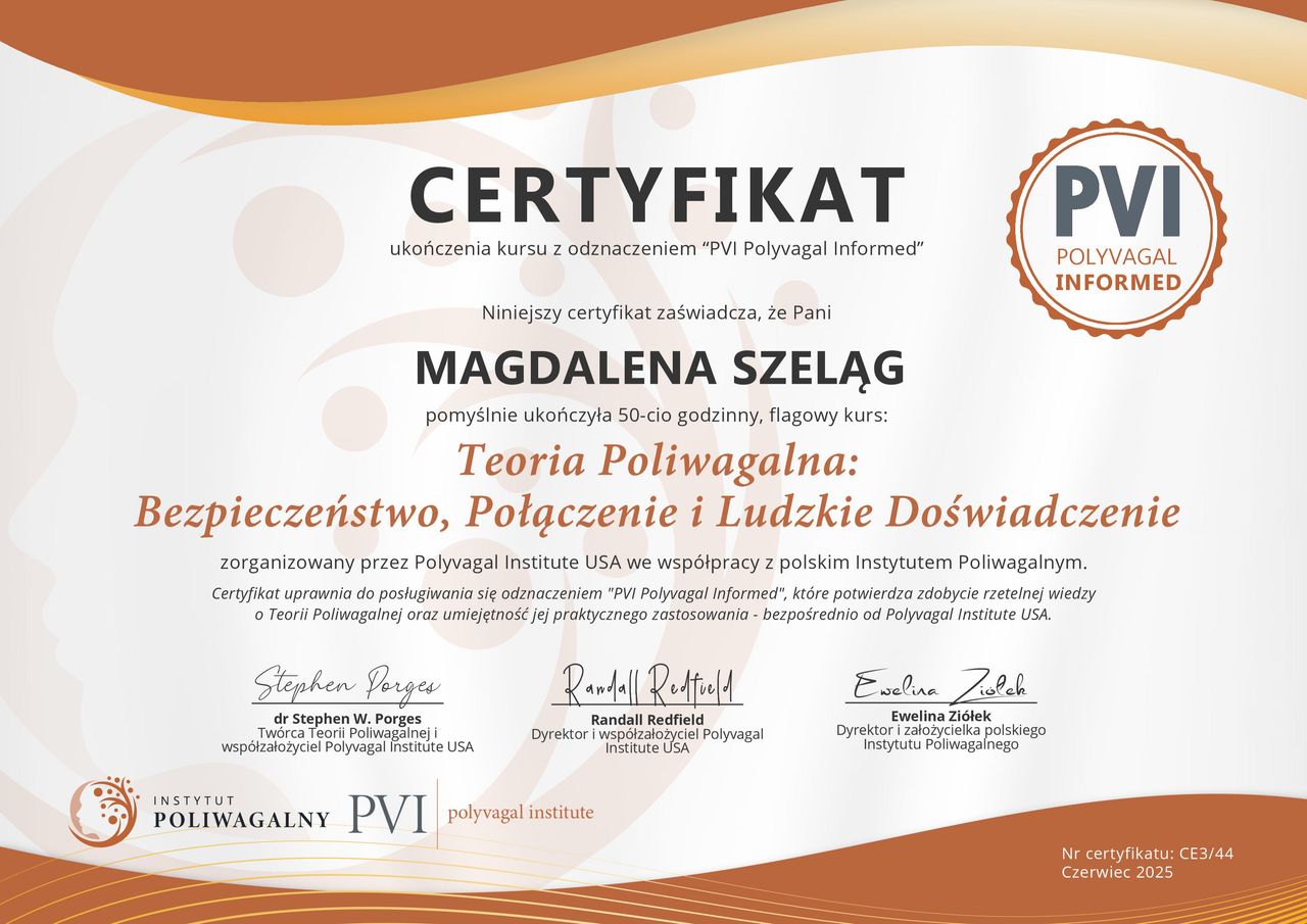 Nazywam się Magdalena Szeląg. Z wykształcenia jestem psychologiem, coachem, trenerem kompetencji społecznych oraz muzykoterapeutą. Jestem również certyfikowanym Terapeutą IFS oraz PVI Polyvagal Informed.
