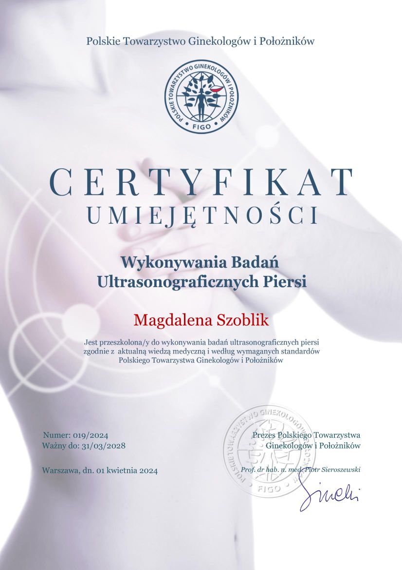 Badania USG Piersi - ponad kilka tysięcy samodzielnie wykonanych USG piersi. Doświadczenie zdobyte w Breat Unit Uniwersyteckie Centrum Leczenia Chorób Piersi - identyfikowanie zmian łagodnych i złośliwych. Posiada Certyfikat PTGiP do wykonywania USG Piersi.