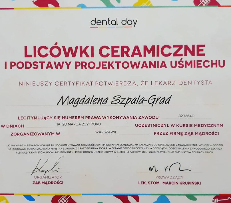 Jaki jest zakres porad oferowanych przez Magdalena Szpala-Grad?Magdalena Szpala-Grad to stomatolog, stomatolog dziecięcy. Na podstawie swojego doświadczenia i wykształcenia Magdalena Szpala-Grad oferuje usługi takie jak: konsultacja stomatologiczna dzieci, Konsultacja stomatologiczna, usunięcie zęba stałego, usunięcie zęba ósmego, wypełnienie w zębie mlecznym, wypełnienie kompozytowe, Odbudowa zniszczonego zęba, Wizyta adaptacyjna dzieci, leczenie kanałowe pod mikroskopem, diagnostyka RTG/CBCT.