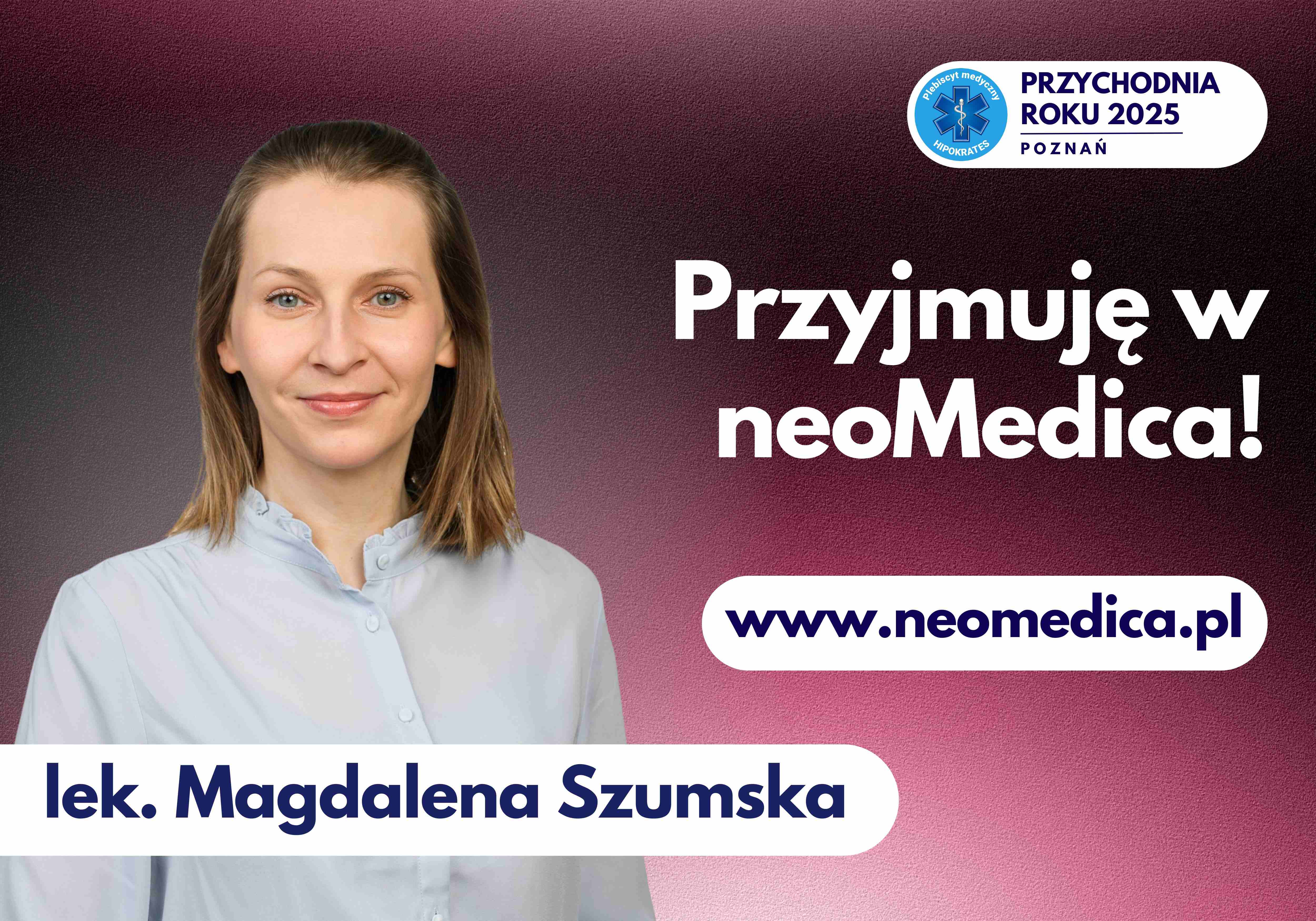 Szanowne Pacjentki, informuję, że od grudnia 2025 przyjmuję w gabinecie gienkologicznym w neoMedica w Poznaniu przy ul. Świetlanej 25.