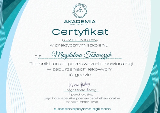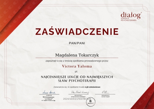 Jestem współwłaścicielka poradni psychologicznej We Love Life Mental Clinic i psychoterapeutą pracującym w nurcie integracyjnym. Uwielbiam pomagać ludziom lepiej zrozumieć siebie, poradzić sobie z trudnymi emocjami i odzyskać wewnętrzną równowagę. Dbam o etykę i wysoką jakość pracy zarówno swojej jak naszego zespołu, regularnie poddając naszą pracę zewnętrznej superwizji oraz interwizji.