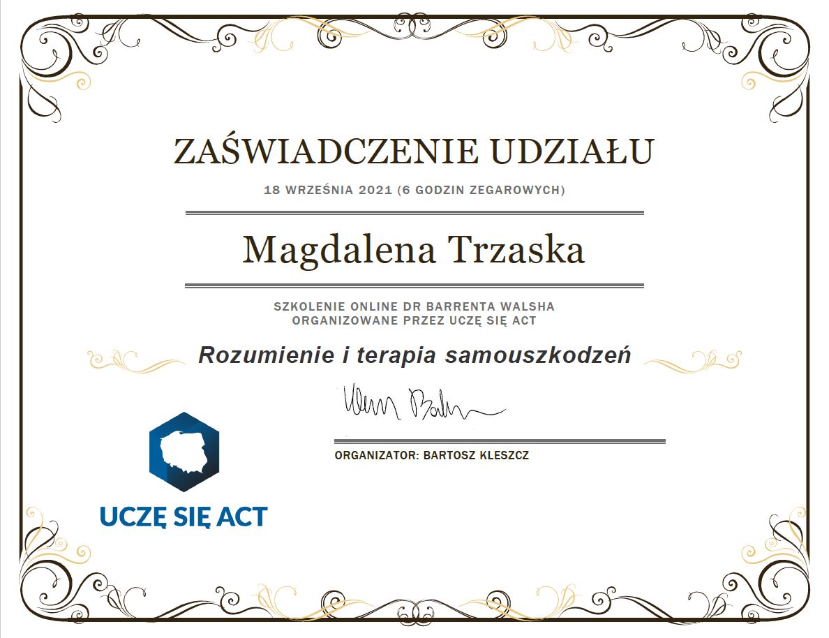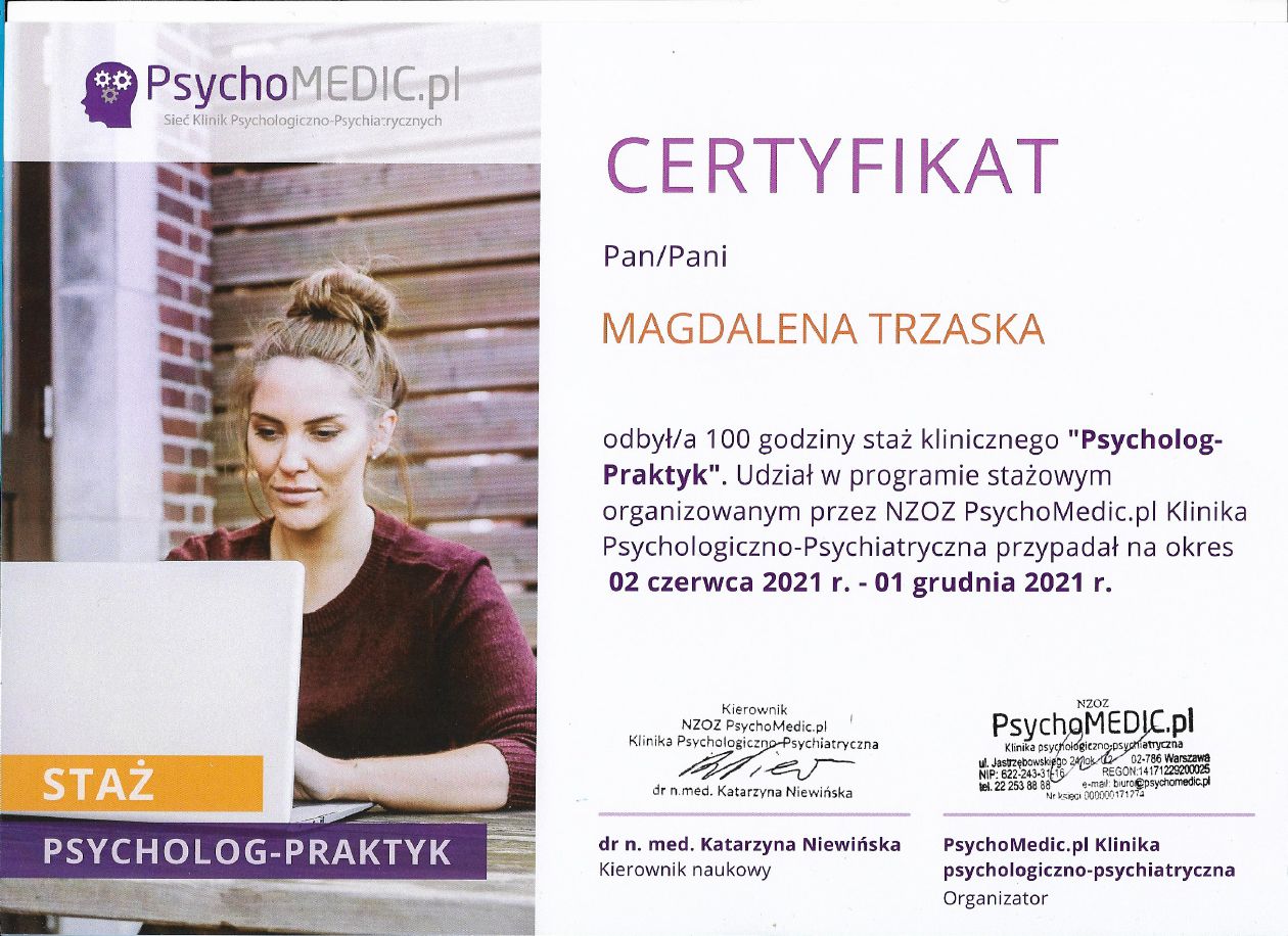 Pani Magdalena pomogła mi przejść przez trudny czas w moim życiu i spojrzeć na niektóre sprawy z dystansem. Dzięki temu uporałam się z wieloma problemami, które utrudniały mi funkcjonowanie na co dzień. Nauczyłam się, jak radzić sobie z podobnymi sytuacjami, które mogą mnie spotkać.