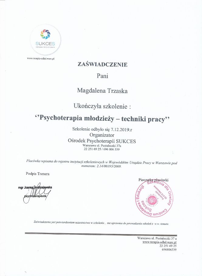 - Praca z młodzieżą zagrożoną samobójstwem i po próbach samobójczych (Ośrodek Psychoterapii SUKCES),