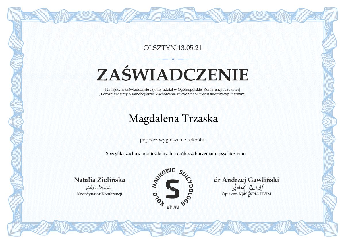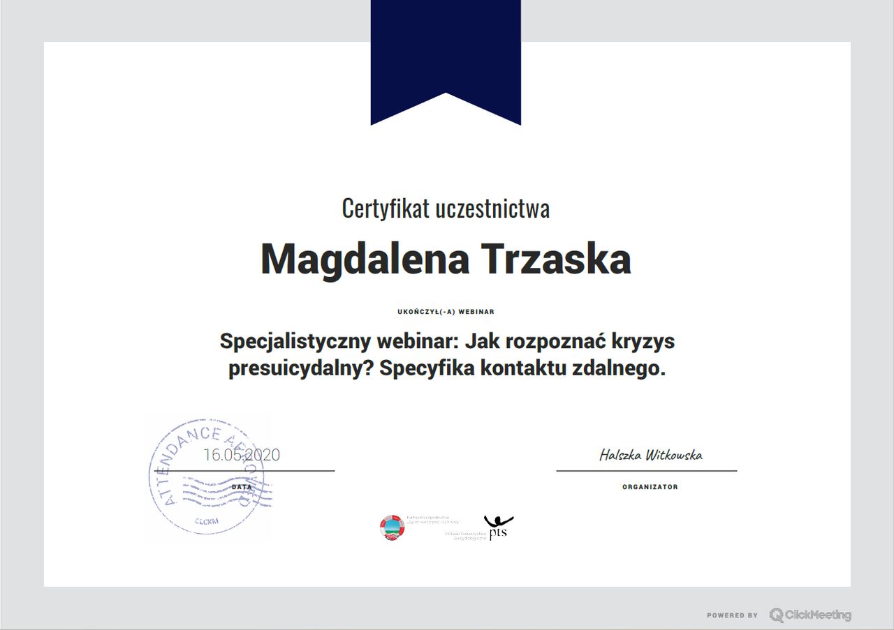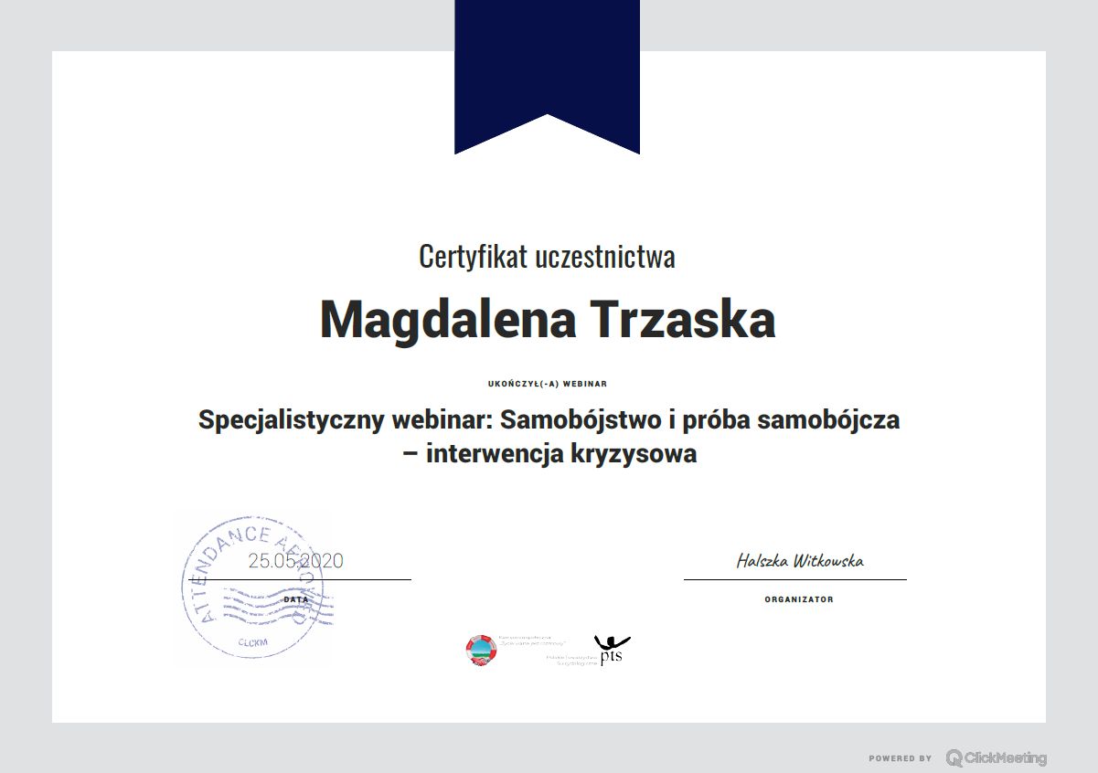 Ukończyłam studia mgr z psychologii oraz studia podyplomowe z suicydologii (nauki o samobójstwach). Jestem w trakcie szkolenia na psychoterapeutkę w Szkole Psychoterapii Poznawczo-Behawioralnej Uniwersytetu SWPS. Swoją pracę poddaję regularnej superwizji.
