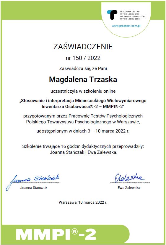 - Stosowanie i interpretacja Minnesockiego Wielowymiarowego Inwentarza Osobowości®– 2 (Pracownia Testów Psychologicznych Polskiego Towarzystwa Psychologicznego).