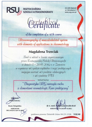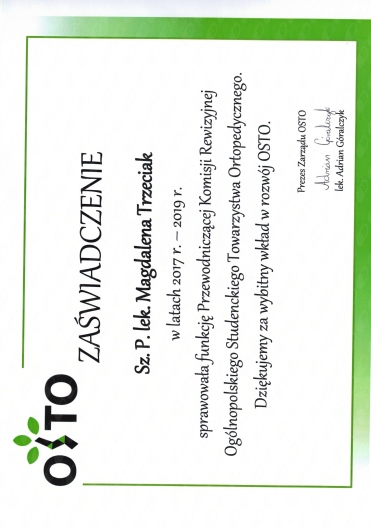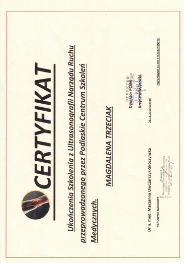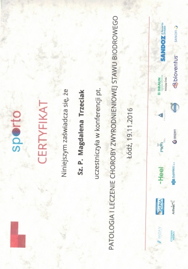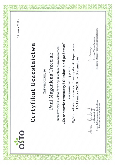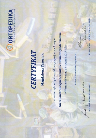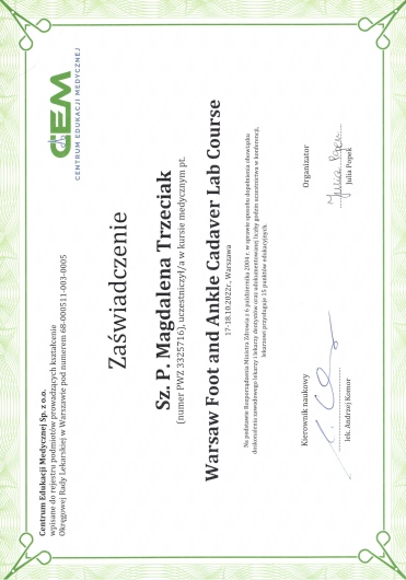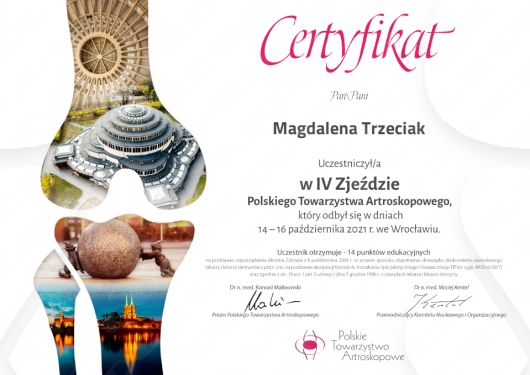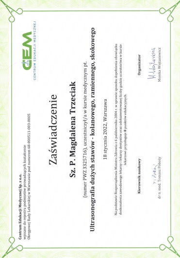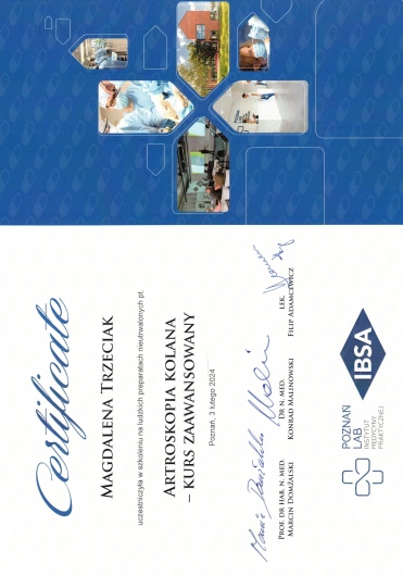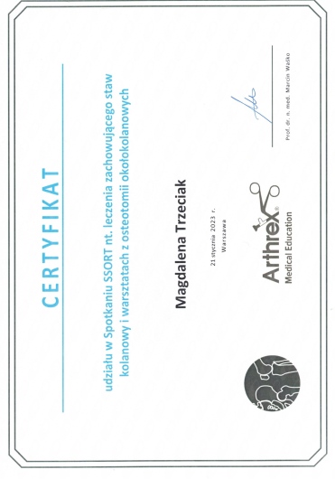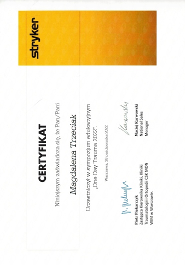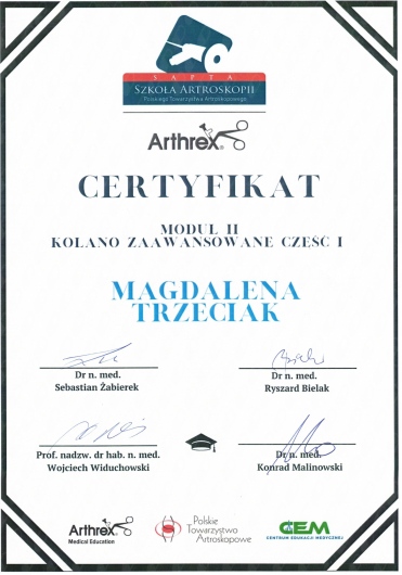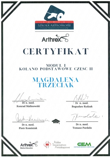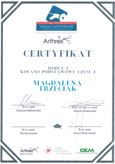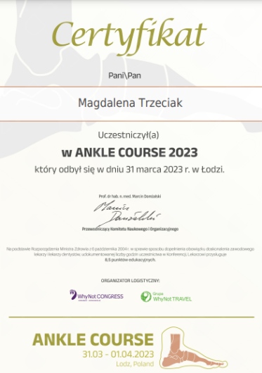 W maju 2025 ukończyłam szkolenie specjalizacyjne, otrzymując dyplom specjalisty z ortopedii i traumatologii narządu ruchu.