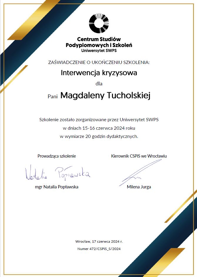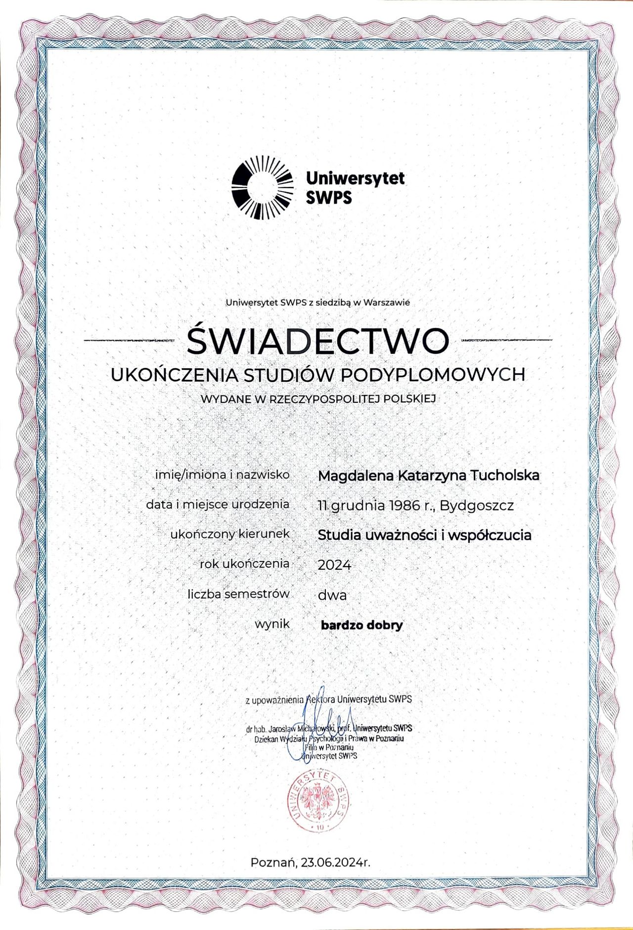 Jestem absolwentką Uniwersytetu SWPS, gdzie ukończyłam studia magisterskie na kierunku psychologia, ze specjalnością psychologia kliniczna. Swoją wiedzę poszerzyłam na studiach podyplomowych z zakresu Uważności i Współczucia (Mindfulness & Compassion), które ukończyłam pod okiem najlepszych specjalistów w tej dziedzinie w Polsce. Mam również za sobą intensywne szkolenie z zakresu interwencji kryzysowej, które pozwala mi wspierać klientów w trudnych i nagłych sytuacjach życiowych. Obecnie szkolę się na psychoterapeutę poznawczo-behawioralnego w certyfikowanym ośrodku szkolącym.