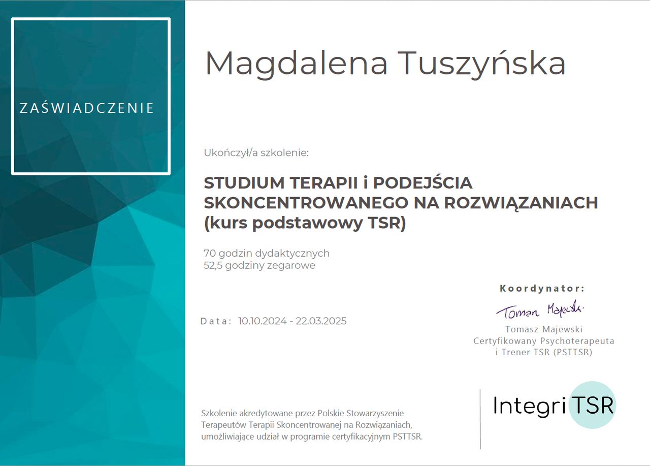 Prywatnie jestem mamą dwójki dzieci. Lubię taniec, podróże, jogę, książki i dobrą kawę. Cenię spokój, bliskość i bycie w ruchu – zarówno w życiu, jak i w rozwoju. Wierzę, że każda zmiana zaczyna się od rozmowy, dlatego z otwartością zapraszam Cię do spotkania.