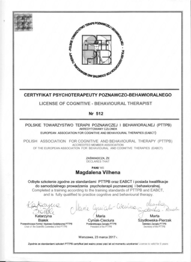 - 4 letnie szkolenie psychoterapeutyczne w Centrum CBT