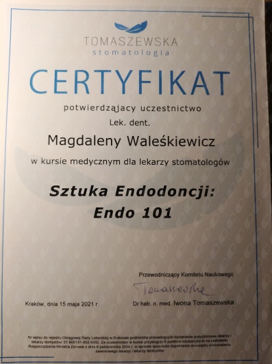 Moją ulubioną dziedziną stała się endodoncja, również w powiększeniu, odbyłam w tym kierunku kilka szkoleń i jestem gotowa na kolejne, aby szlifować swoje umiejętności.