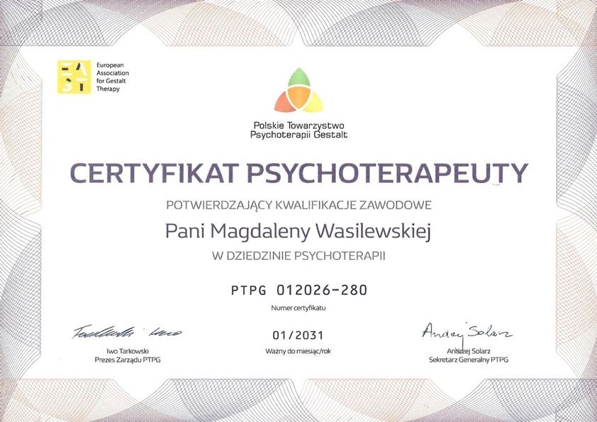 Jestem certyfikowaną psychoterapeutką Gestalt. Posiadam certyfikaty wydane przez Polskie Towarzystwo Psychoterapii Gestalt (PTPG) oraz Europejskie Stowarzyszenie Psychoterapii Gestalt (EAGT). Ukończyłam 4-letnią szkołę psychoterapii w Instytucie Integralnej Psychoterapii Gestalt w Krakowie, akredytowanym przez Europejskie Stowarzyszenie Psychoterapii (EAP) oraz Europejskie Stowarzyszenie Psychoterapii Gestalt (EAGT) oraz roczny staż w Krakowskim Instytucie Terapii Gestalt. Jestem absolwentką Szkoły Trenerów i Coachów w Grupie TROP (Trening Rozwoju Organizacji Przyszłości) w Warszawie. Jestem członkiem Polskiego Towarzystwa Psychoterapii Gestalt. Doświadczenie zawodowe zdobywałam w Centrum Terapii Nerwic w Mosznej oraz na Oddziale Dziennym Psychiatrycznym w Krapkowicach. Pracuję zgodnie z Kodeksem Etyki Europejskiego Towarzystwa Terapii Gestalt. Moje umiejętności ciągle poszerzam podczas licznych warsztatów i treningów. Moją pracę poddaję regularnej superwizji. Psychoterapia to dla mnie proces docierania do siebie. U podstaw modalności, którą wybrałam leży uzdrawiające działanie autentycznego kontaktu, opartego na szacunku i akceptacji. Podejście Gestalt umożliwia nie tylko poznanie, ale i doświadczenie swoich ograniczeń oraz spróbowanie czegoś nowego w bezpiecznych warunkach profesjonalnej relacji terapeutycznej. Zapraszam.