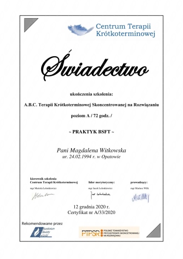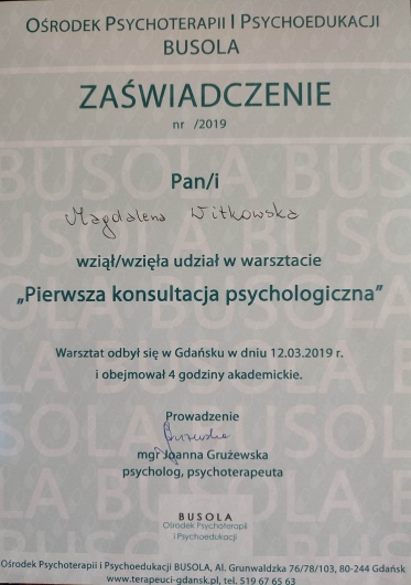 Pani Magdalena Witkowska jest osobą niezwykle empatyczną i w pełni zaangażowaną w spotkanie z drugą osobą. Potrafi stworzyć bardzo przyjazną atmosferę i nieskrępowaną przestrzeń do rozmowy, co jest szczególnie ważne przy spotkaniach online.