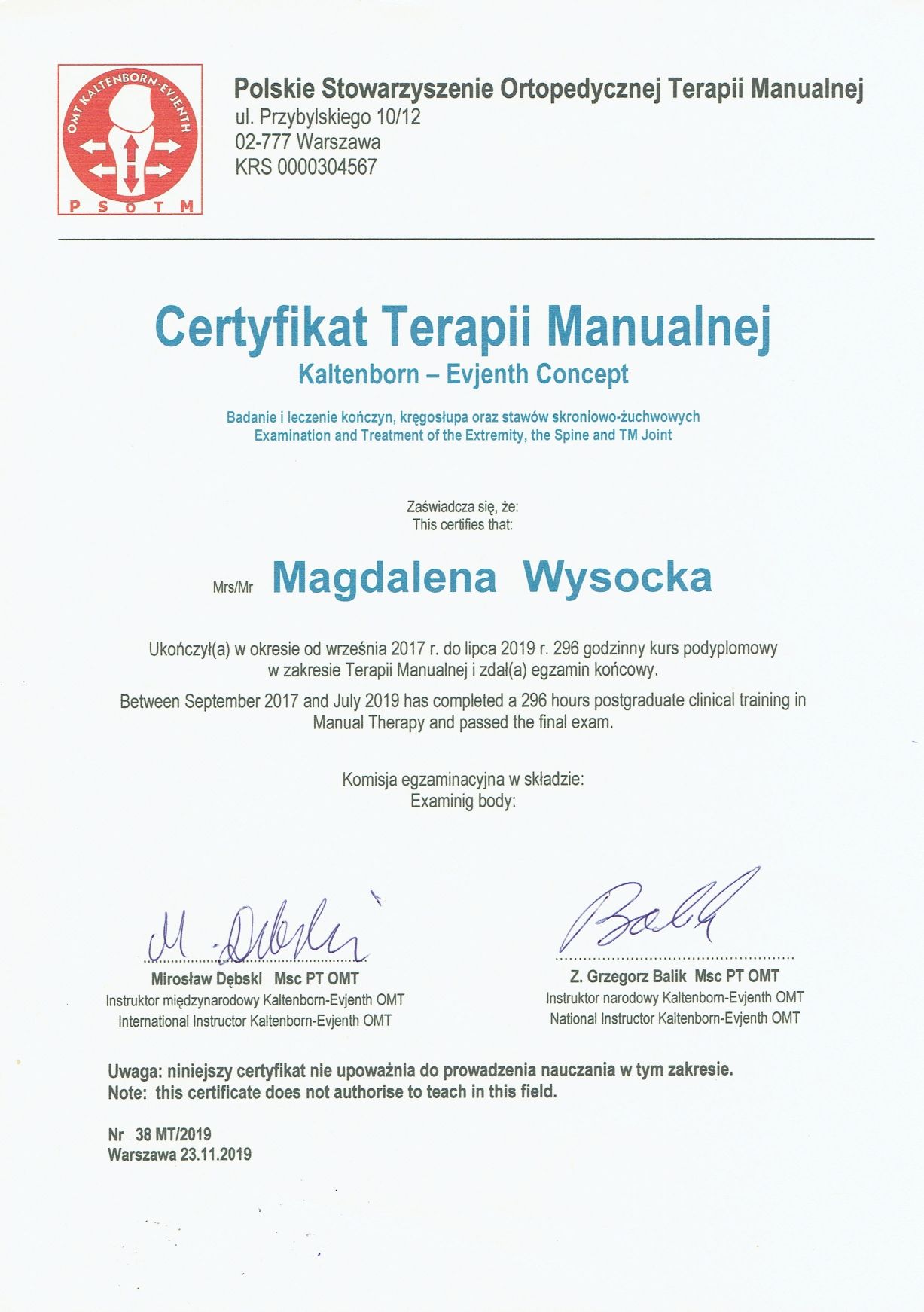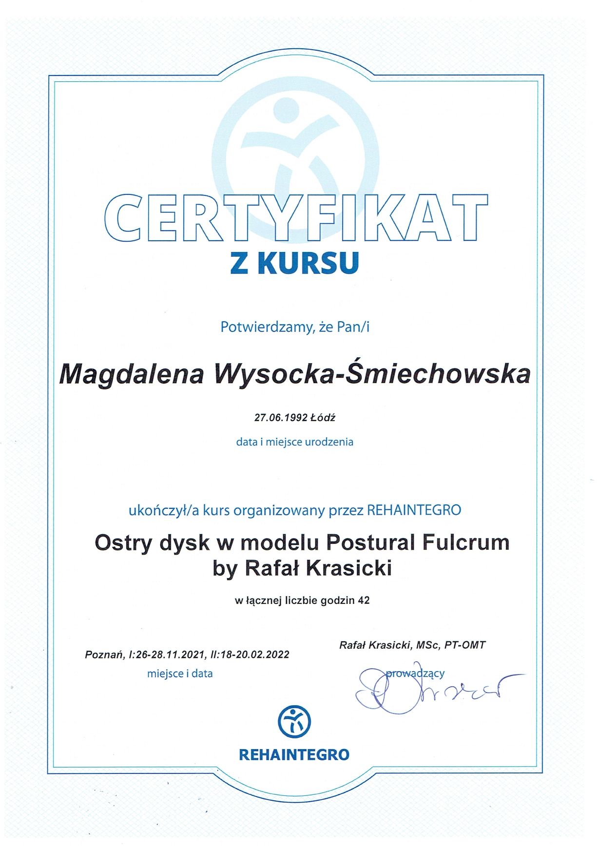 Zależy mi, aby terapia była nie tylko skuteczna, ale również zrozumiała – tak, by pacjent mógł aktywnie uczestniczyć w procesie leczenia i lepiej rozumieć swoje ciało. Moim celem jest poprawa komfortu życia, powrót do sprawności i budowanie świadomości ruchu.