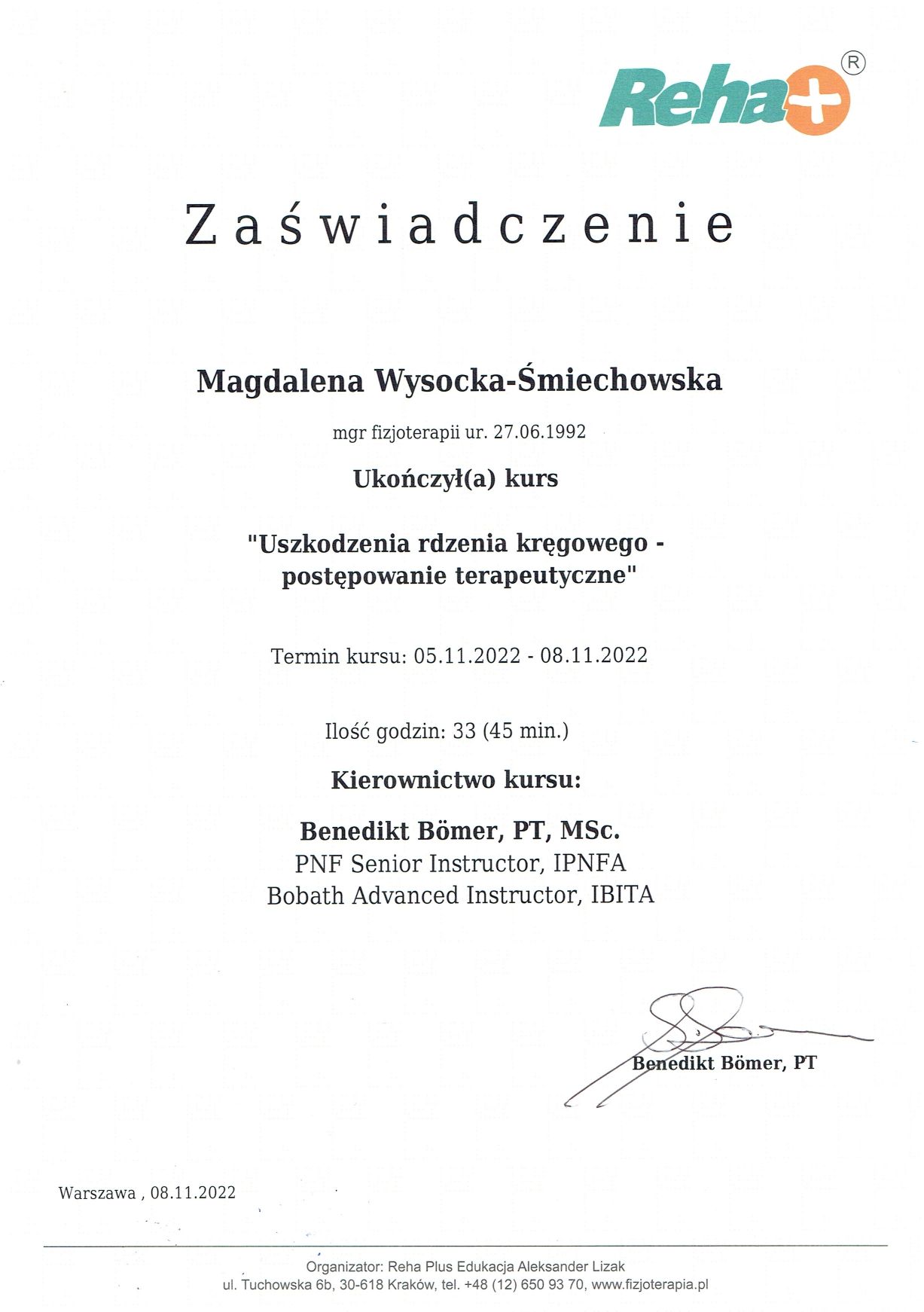 W pracy wykorzystuję m.in. terapię manualną wg koncepcji Kaltenborn-Evjenth, metodę CRAFTA, koncepcję IBITA Bobath, terapię powięziową, trening medyczny. Staram się ciągle zdobywać nową wiedzę, łączę różne podejścia, dobierając terapię indywidualnie do potrzeb każdego pacjenta.