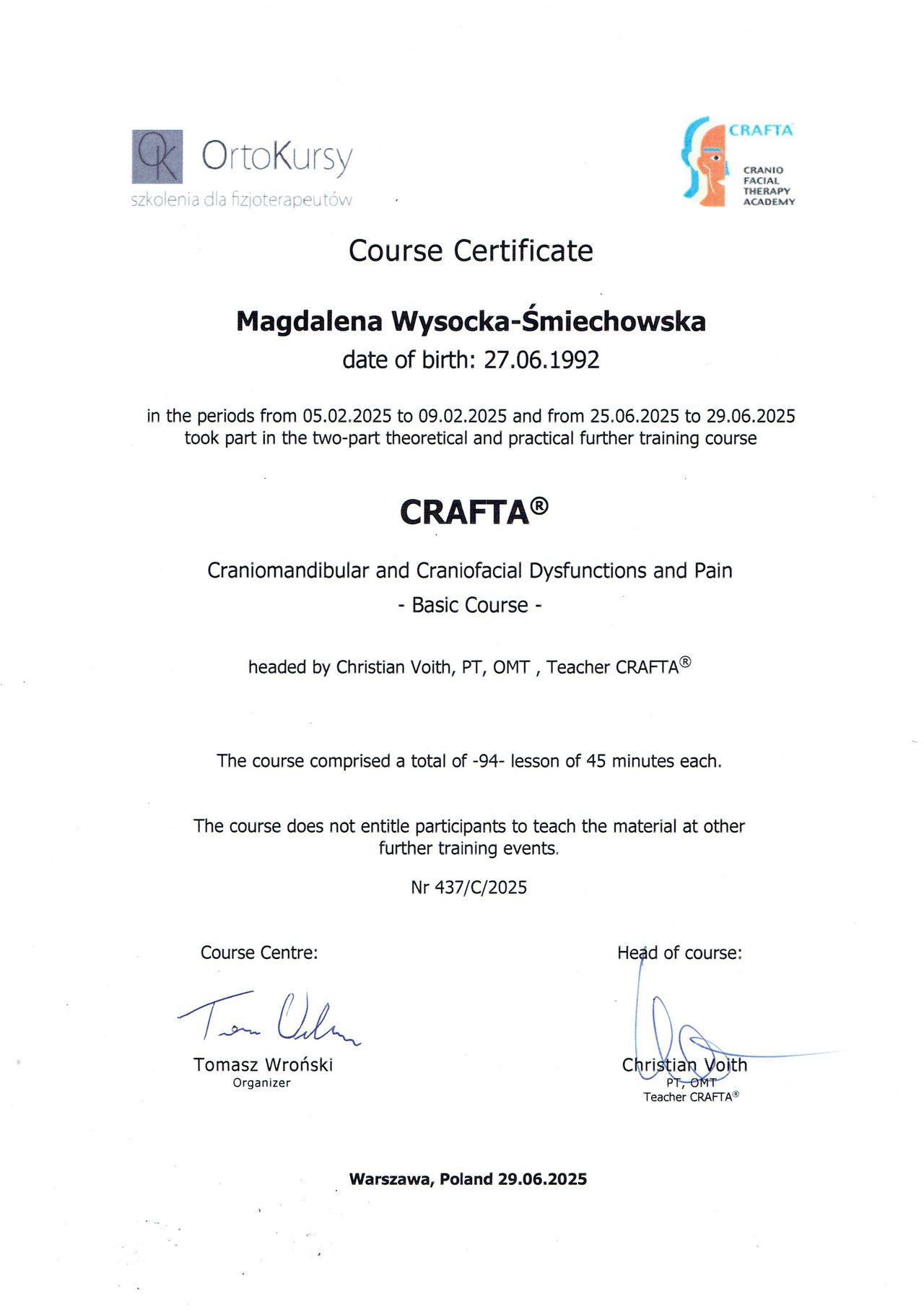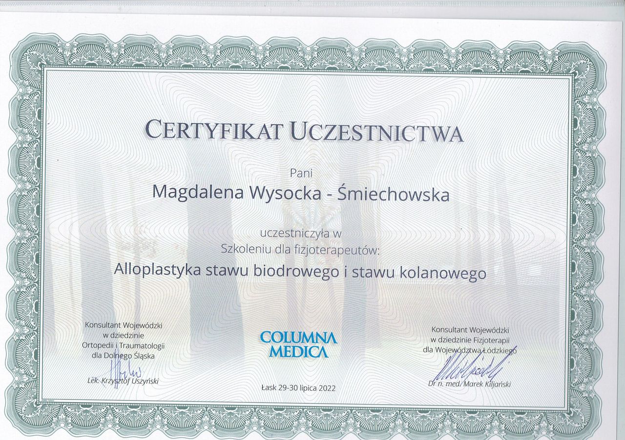 Jestem magistrem fizjoterapii, absolwentką Uniwersytetu Medycznego w Łodzi. Od 2020 roku pracuję w klinice Columna Medica, gdzie wspieram pacjentów ortopedycznych (głównie bóle kręgosłupa), neurologicznych oraz osoby z problemami w obszarze czaszkowo-żuchwowym oraz czaszkowo-twarzowym.