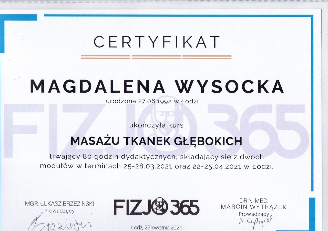 Polecam Pania Magdę jako fizjoterapeute . Jest osobą bardzo zaangażowana i sumienną. Na pierwszej wizycie profesjonalnie przeprowadziła wywiad i ustaliła rodzaje zabiegów. Zabiegi przeprowadziła solidnie .