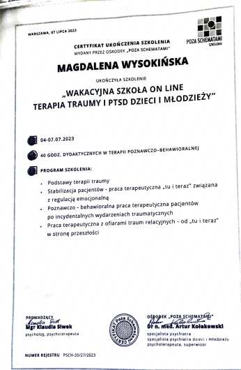 Jaki jest zakres porad oferowanych przez Magdalena Wysokińska?Magdalena Wysokińska to psycholog. Na podstawie swojego doświadczenia i wykształcenia Magdalena Wysokińska oferuje usługi takie jak: konsultacja online, Terapia EMDR on-line, Konsultacja psychologiczna, Terapia EMDR, Terapia psychologiczna, Diagnoza zaburzeń osobowości - SCID-5-PD, Diagnoza inteligencji (dorośli i dzieci) - Stanford-Binnet 5, Diagnoza ADHD test diva 5.0, ADOS-2 - diagnoza autyzmu u dzieci, młodzieży i dorosłych, Diagnoza autyzmu.