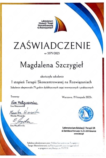 Chciałabym wyrazić, że jestem bardzo zadowolona z dotychczasowych spotkań. Widzę wyraźne rezultaty naszej pracy, które pozytywnie wpływają na moje samopoczucie i codzienne funkcjonowanie. Dziękuję za zaangażowanie i wsparcie:)