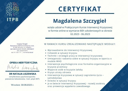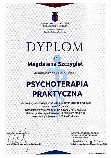 Jestem absolwentką Psychologii stosowanej na Uniwersytecie Jagiellońskim w Krakowie. Obecnie w trakcie 4-letniego szkolenia psychoterapeutycznego w nurcie poznawczo-behawioralnym, organizowanego przez Instytut Poznawczy, który posiada akredytację Polskiego Towarzystwa Terapii Poznawczej i Behawioralnej (PTTPiB). Prowadzę konsultacje i poradnictwo psychologiczne dla dorosłych stacjonarnie oraz online. Pracuję przede wszystkim w oparciu o techniki Terapii Skoncentrowanej na Rozwiązaniach (TSR), Terapii Poznawczo-Behawioralnej (CBT) i Terapii Systemowej. Swoją pracę poddaję regularnej superwizji. Najważniejszą wartością jest dla mnie drugi człowiek, dlatego kładę szczególny nacisk na akceptację, otwartość i nawiązywanie relacji terapeutycznej opartej na wzajemnym zaufaniu. Doświadczenie zawodowe zdobywałam m.in. w: - Oddziale Dziennym Leczenia Nerwic i Zaburzeń Behawioralnych w Zakładzie Psychoterapii Szpitala Uniwersyteckiego w Krakowie, - Oddziale Dziennym Rehabilitacji Psychiatrycznej Szpitala Uniwersyteckiego w Krakowie, - Oddziale Ogólnopsychiatrycznym Klinicznego Szpitala im. J. Babińskiego w Krakowie, - Poradni Psychologiczno-Pedagogicznej nr 4 im. Janusza Korczaka w Krakowie - Szkole Podstawowej z Oddziałami Integracyjnymi nr 30 im. Kazimierza Pułaskiego w Krakowie. Dbam o to by stale aktualizować swoją wiedzę i doskonalić umiejętności z zakresu zdrowia psychicznego. Ukończyłam m.in. kursy i szkolenia: - “Psychoterapia praktyczna” organizowany przez Medyczne Centrum Kształcenia Podyplomowego UJ oraz Katedrę Psychoterapii UJ CM, - Praktyczny Kurs Interwencji Kryzysowej w Instytucie Terapii Poznawczo Behawioralnej, - szkolenie z zakresu Terapii Skoncentrowanej na Rozwiązaniach w Laboratorium Edukacji i Terapii Skoncentrowanej na Rozwiązaniach, - Szkolenie “Poradnictwo Psychologiczne” organizowane przez Fundację Inspirator. Ukończyłam dwa procesy własne, które integrowały różne metody pracy terapeutycznej i rozwojowej m.in. techniki nurtu systemowego, Gestalt i coachingu. Wspieram w: - samorozwoju, procesie definiowania siebie, swoich wartości i zasobów, - planowaniu i realizacji celów, - budowaniu zdrowych i satysfakcjonujących relacji, - radzeniu sobie z perfekcjonizmem i prokrastynacją, - przechodzeniu przez trudne sytuacje życiowe, zmiany, utraty - wychodzeniu z kryzysów sytuacyjnych i rozwojowych (m.in. kryzys tożsamości, kryzys ćwierci wieku) - pracy nad samooceną, pewnością siebie, asertywnością i umiejętnością stawiania granic - radzeniu sobie ze stresem i trudnymi emocjami Świadomość daje wybór, dlatego jeśli chcesz uwolnić się spod wpływu oczekiwań i przekonań, które nie należą do Ciebie, zapraszam Cię do wspólnej pracy ku zrozumieniu i odwadze do kształtowania swojego życia zgodnie z własnymi wartościami.