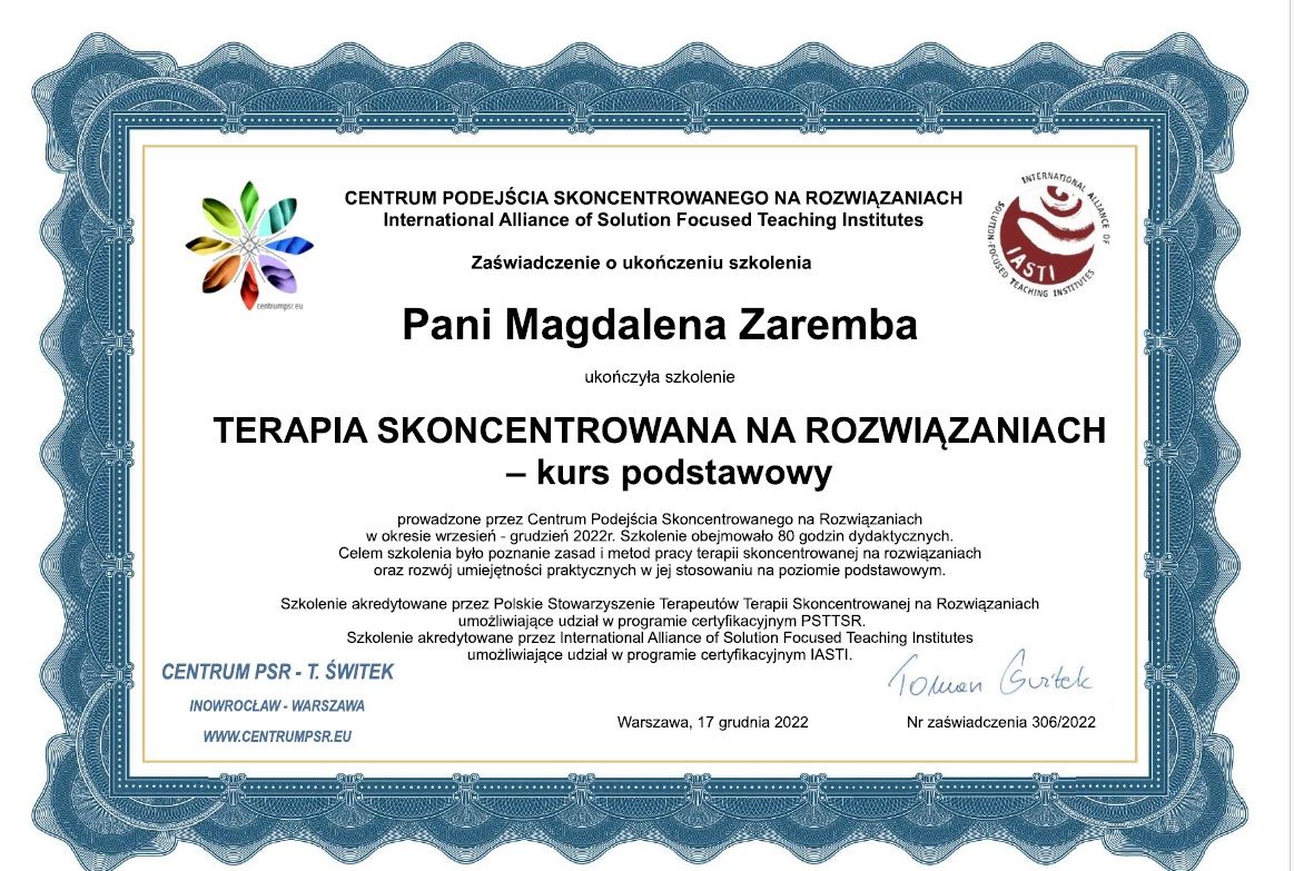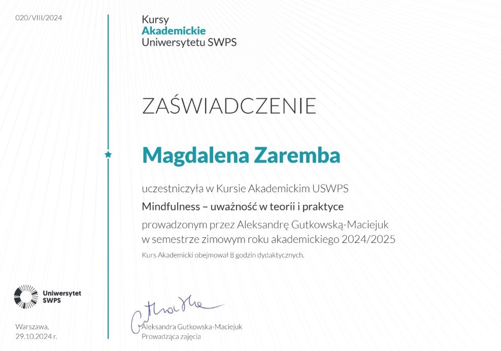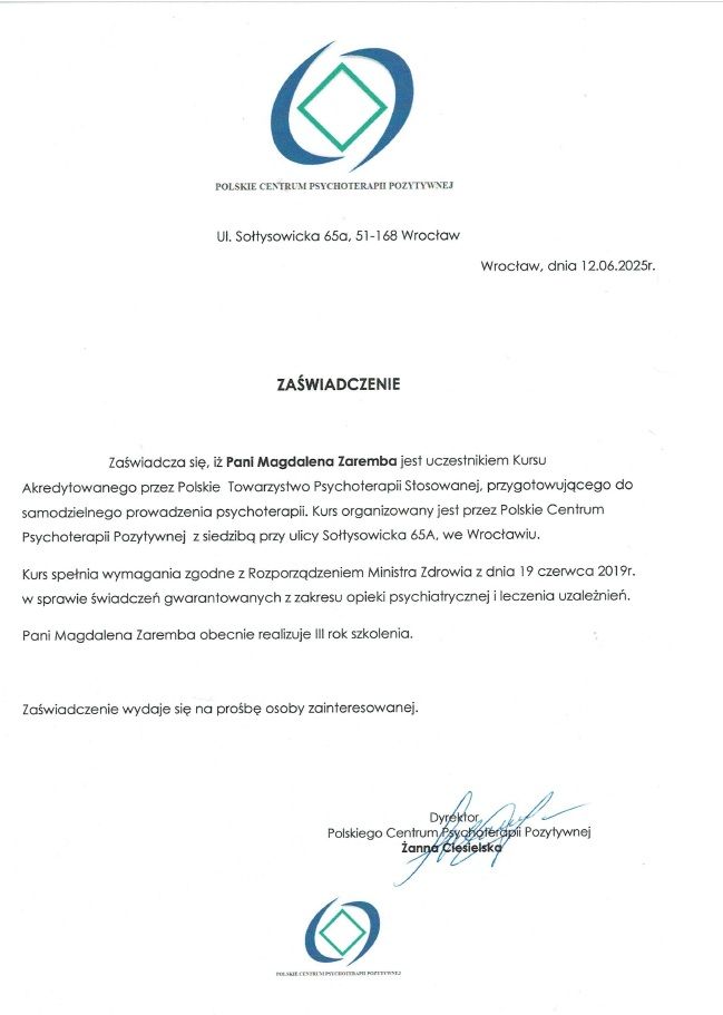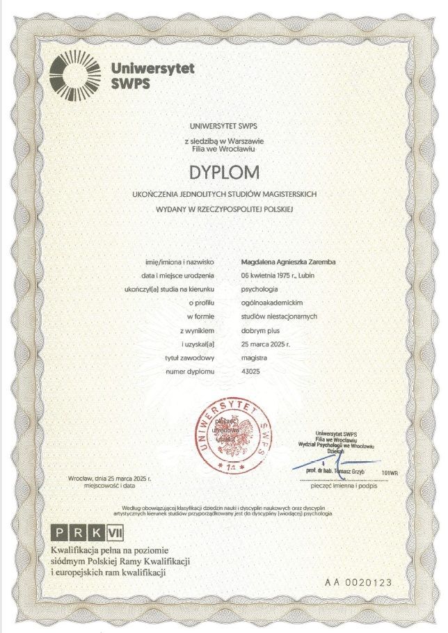 Jestem absolwentką psychologii (specjalność kliniczna) na Uniwersytecie SWPS we Wrocławiu, psychoterapeutką w trakcie certyfikacji we Wrocławskim Instytucie Psychoterapeutycznym oraz Szkole Psychoterapii Centrum CBT, przygotowującej do uzyskania certyfikatu psychoterapeuty poznawczo - behawioralnego (kurs rekomendowany przez Polskie Towarzystwo Terapii Poznawczej i Behawioralnej - PTTPB). Posiadam również uprawnienia mediatora rodzinnego, co pozwala mi efektywnie wspierać osoby w trudnych sytuacjach. Jestem członkinią Polskiego Towarzystwa Psychoterapii Stosowanej, które stanowi dla mnie przestrzeń do rozwoju zawodowego i ciągłego doskonalenia swoich kompetencji. Odbyłam podstawowe szkolenia w zakresie Terapii Skoncentrowanej na Rozwiązaniach (TSR) oraz Racjonalnej Terapii Zachowań (RTZ).