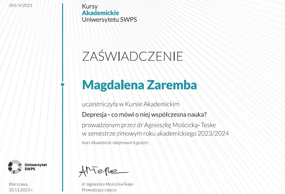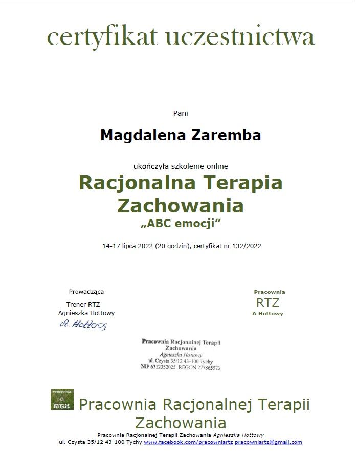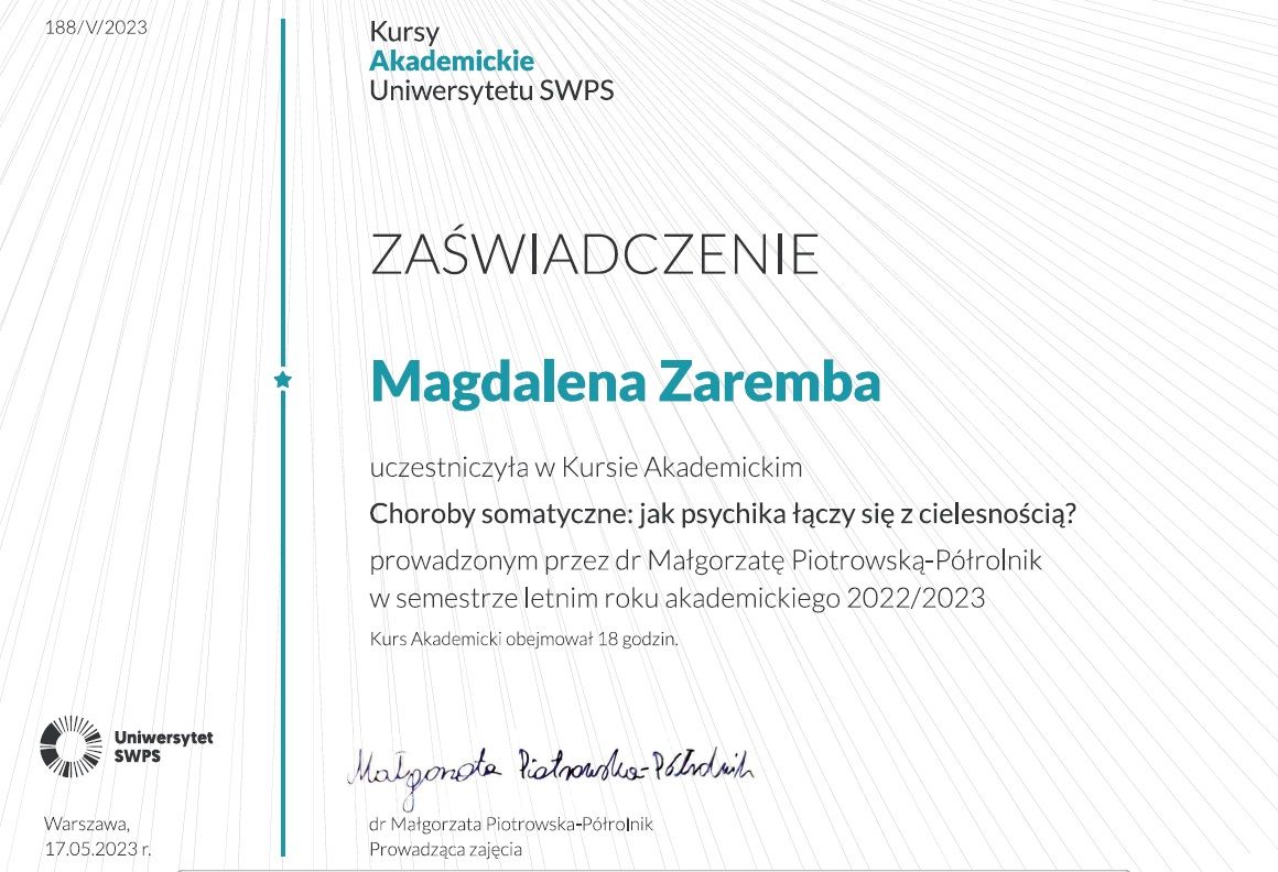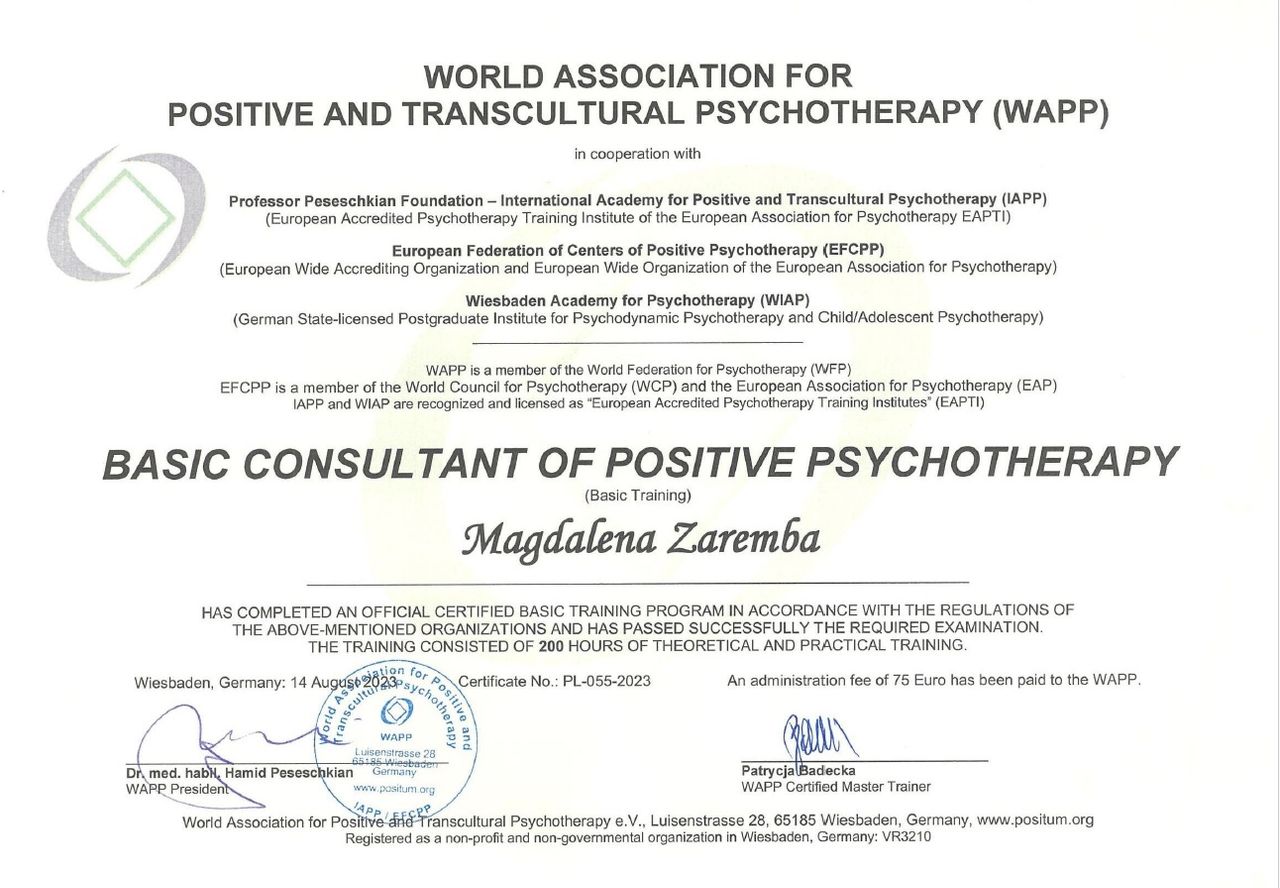 Jestem absolwentką psychologii (specjalność kliniczna) na Uniwersytecie SWPS we Wrocławiu, psychoterapeutką w trakcie certyfikacji we Wrocławskim Instytucie Psychoterapeutycznym oraz Szkole Psychoterapii Centrum CBT, przygotowującej do uzyskania certyfikatu psychoterapeuty poznawczo - behawioralnego (kurs rekomendowany przez Polskie Towarzystwo Terapii Poznawczej i Behawioralnej - PTTPB). Posiadam również uprawnienia mediatora rodzinnego, co pozwala mi efektywnie wspierać osoby w trudnych sytuacjach. Jestem członkinią Polskiego Towarzystwa Psychoterapii Stosowanej, które stanowi dla mnie przestrzeń do rozwoju zawodowego i ciągłego doskonalenia swoich kompetencji. Odbyłam podstawowe szkolenia w zakresie Terapii Skoncentrowanej na Rozwiązaniach (TSR) oraz Racjonalnej Terapii Zachowań (RTZ).