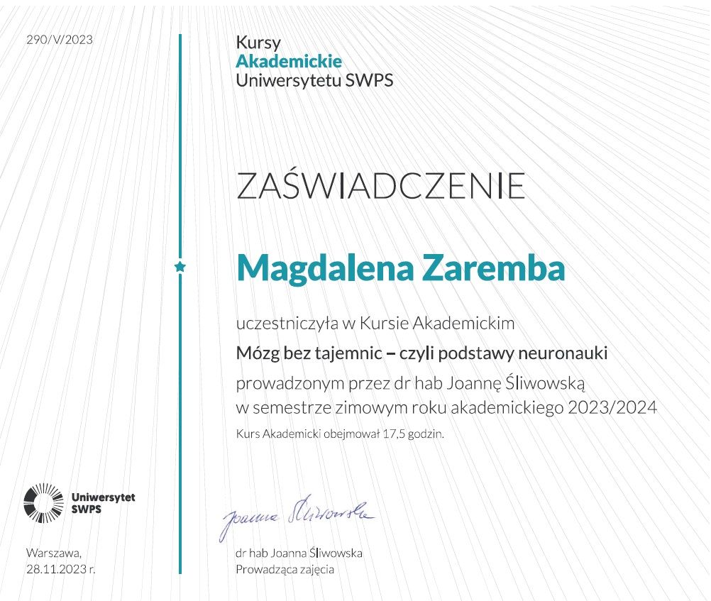 praktyce”, „Depresja – co mówi o niej współczesna nauka”, „ Mózg bez tajemnic – czyli podstawy neuronauki”, „Choroby somatyczne – jak psychika łączy się z cielesnością”. Doświadczenie zawodowe zdobyłam podczas praktyk klinicznych w Wojewódzkim Szpitalu Specjalistycznym w Legnicy oraz Uniwersyteckim Szpitalu Klinicznym w Katedrze Psychiatrii we Wrocławiu na dziennych oddziałach psychiatrycznych.