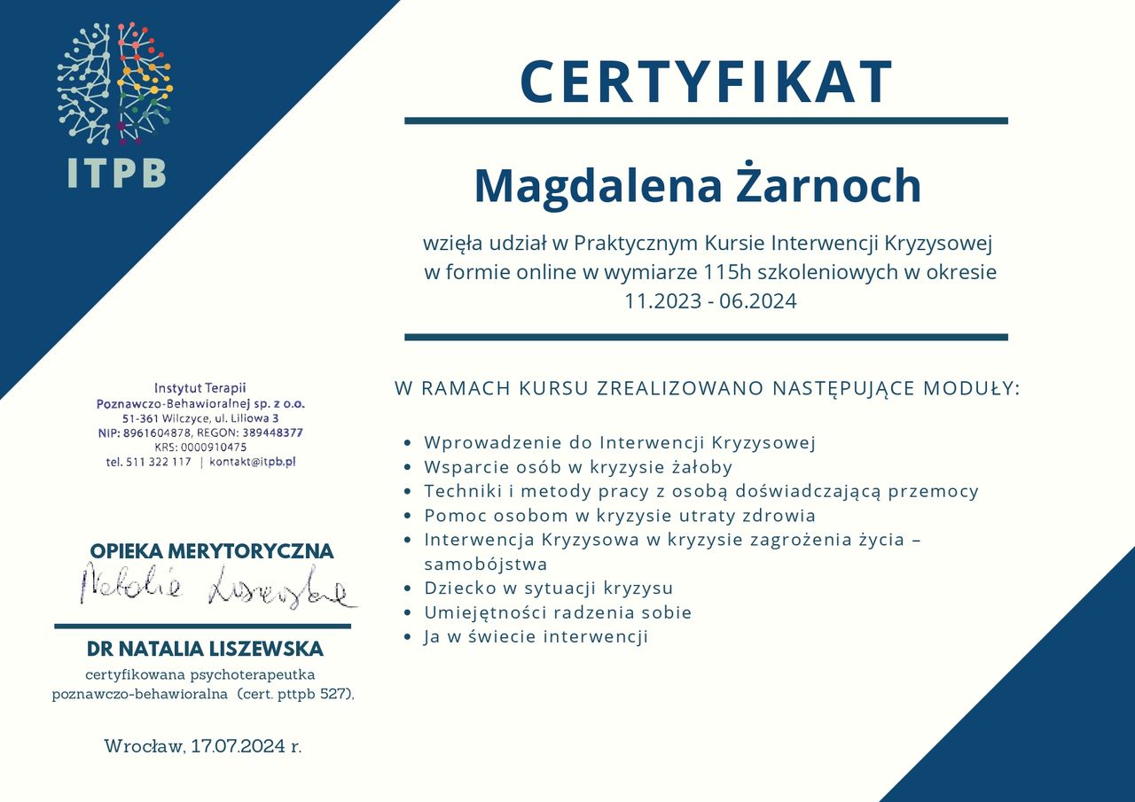 Jaki jest zakres porad oferowanych przez Magdalena Żarnoch ?Magdalena Żarnoch to psycholog. Na podstawie swojego doświadczenia i wykształcenia Magdalena Żarnoch oferuje usługi takie jak: Konsultacja psychologiczna, diagnoza ADHD dla dorosłych, Konsultacja psychologiczna online.