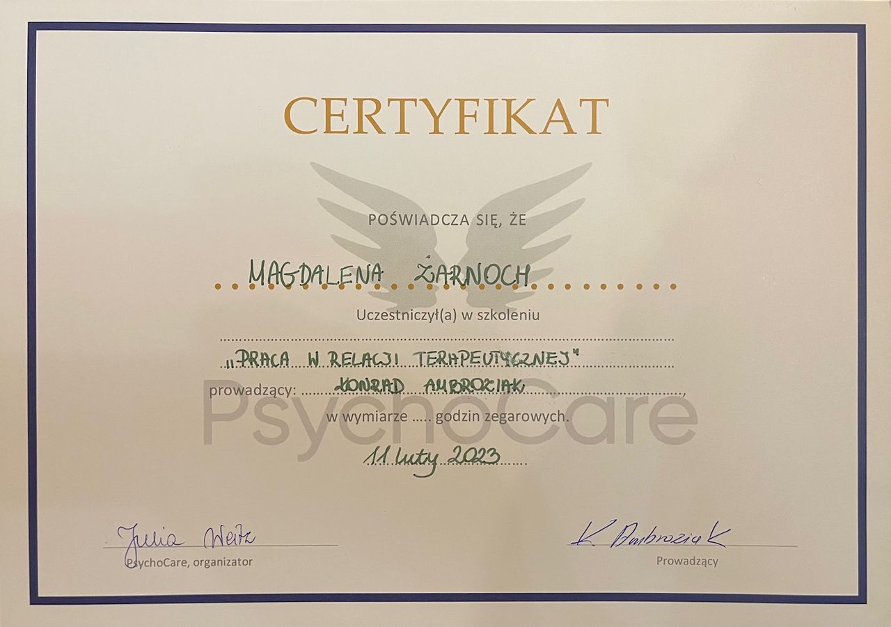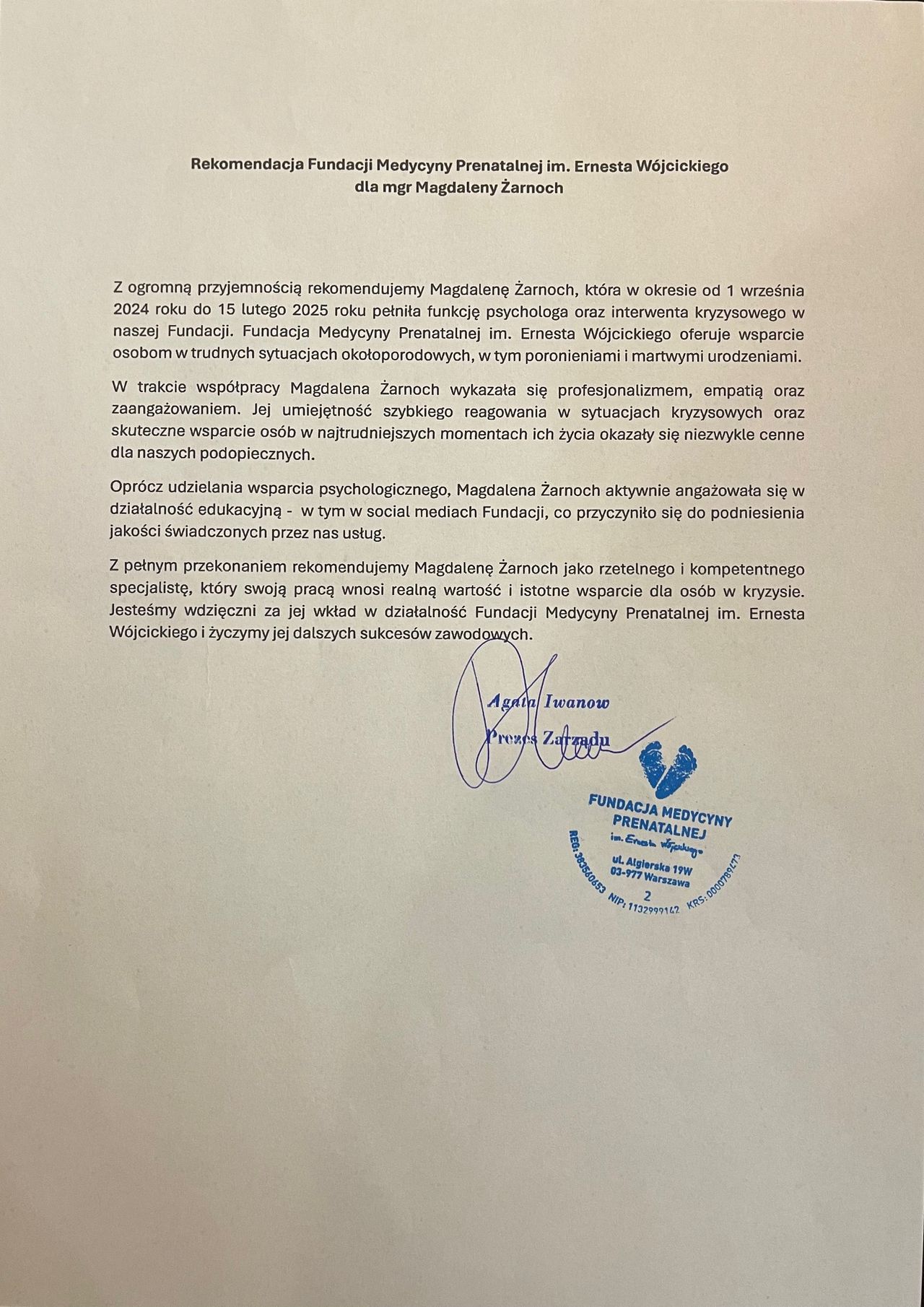 Miałam przyjemność uczestniczyć w 12-tygodniowej psychoedukacji ADHD prowadzonej przez Panią Magdalenę. To specjalistka o wyjątkowym profesjonalizmie, ogromnej empatii i wrażliwości. Każde spotkanie przebiegało w atmosferze ciepła, zrozumienia i pełnej życzliwości.