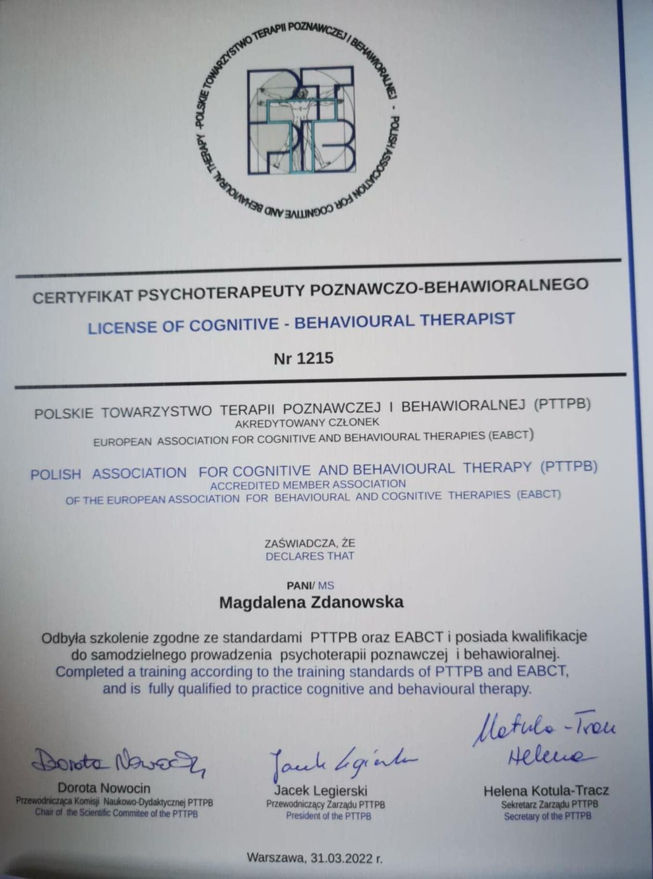 Uczestniczyłam w szkoleniu psychoterapeutycznym dzieci i młodzieży w Centrum Terapii Poznawczo-Behawioralnej w Warszawie oraz w szkoleniu w Centrum Terapeutyczno-Szkoleniowym Ter-Cognitiva w Krakowie. Przeszłam szkolenie zgodne ze standardami PTTPB i EABCT, uzyskując kwalifikacje do samodzielnego prowadzenia psychoterapii poznawczo-behawioralnej (licencja nr 1215).