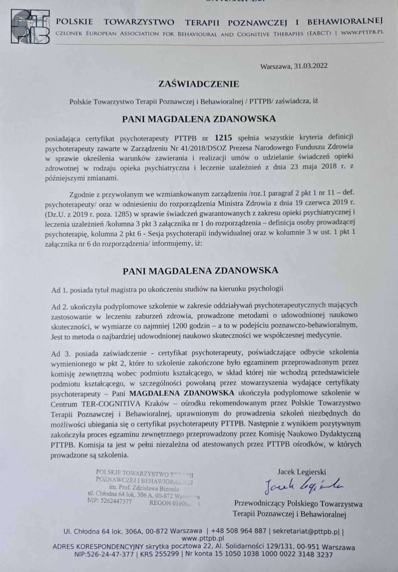 Jaki jest zakres porad oferowanych przez Magdalena Zdanowska?Magdalena Zdanowska to psychoterapeuta certyfikowany. Na podstawie swojego doświadczenia i wykształcenia Magdalena Zdanowska oferuje usługi takie jak: psychoterapia młodzieży, psychoterapia dzieci, psychoterapia indywidualna, konsultacja online, konsultacja psychoterapeutyczna, Psychoterapia, psychoterapia online, konsultacja psychoterapeutyczna (pierwsza wizyta), bezpłatna konsultacja wstępna - telefoniczna, Konsultacja psychologiczna.
