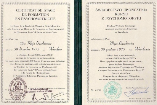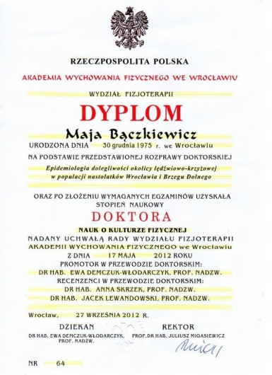 dr nauk o kulturze fizycznej, praca doktorska obroniona na wydziale Fizjoterapii AWF Wrocław w 2012 roku