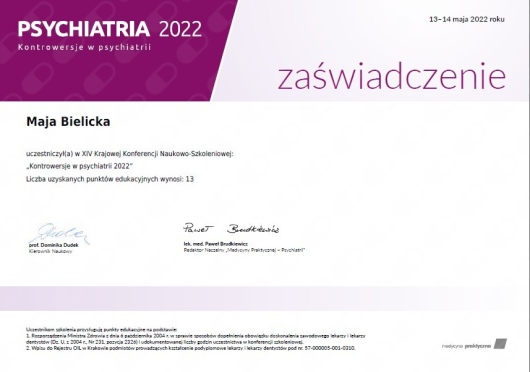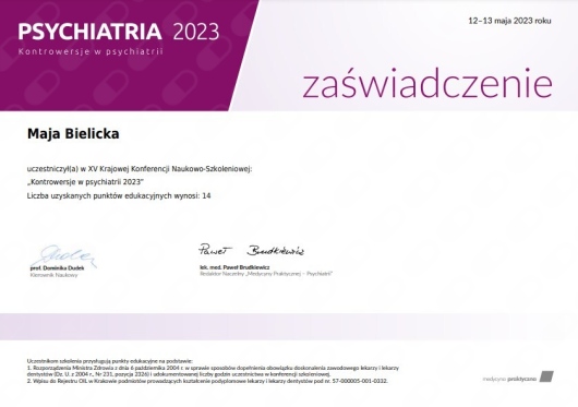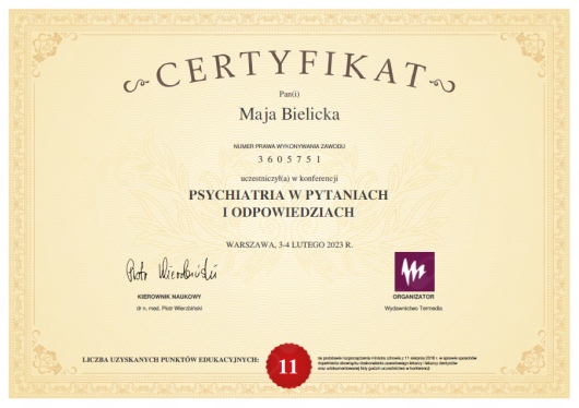Jaki jest zakres porad oferowanych przez Maja Bielicka?Maja Bielicka to w trakcie specjalizacji (psychiatra). Na podstawie swojego doświadczenia i wykształcenia Maja Bielicka oferuje usługi takie jak: konsultacja psychiatryczna (pierwsza wizyta), konsultacja psychiatryczna (kolejna wizyta), konsultacja online.