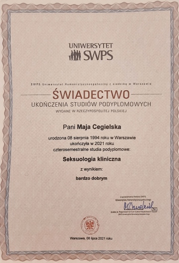Jaki jest zakres porad oferowanych przez Maja Cegielska-Patyk?Maja Cegielska-Patyk to seksuolog, psycholog, psychoterapeuta. Na podstawie swojego doświadczenia i wykształcenia Maja Cegielska-Patyk oferuje usługi takie jak: konsultacja online, konsultacja seksuologiczna, Konsultacja psychologiczna, Konsultacja psychologiczna online, psychoterapia indywidualna, konsultacja psychoterapeutyczna, Psychoterapia, terapia seksuologiczna, konsultacja psychologiczno-seksuologiczna dla par, konsultacja seksuologiczna online.