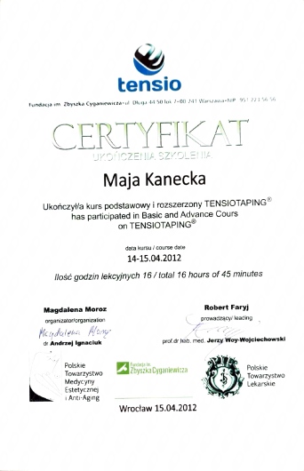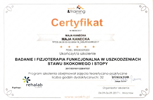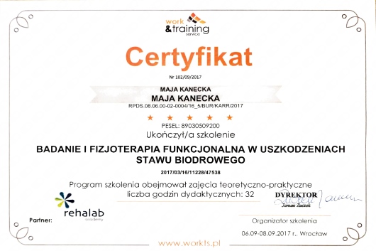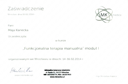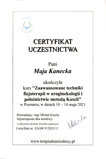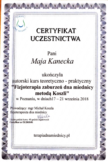Jestem absolwentką Wydziału Fizjoterapii na Akademii Wychowania Fizycznego we Wrocławiu. W terapii uroginekologicznej opieram się na Metodzie Koszli. W swojej pracy wykorzystuję również techniki tkanek miękkich – w tym punkty spustowe, terapię powięziową oraz masaż; terapię manualną, metodę Kinesiotaping-u oraz elementy koncepcji PNF-u i McKenzie-go. Przykładam też dużą wagę do ćwiczeń leczniczych, w szczególności do rozciągania mięśni i ćwiczeń stabilizujących stawy.