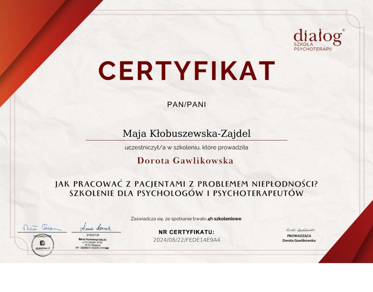 Jestem psycholożką oraz psychoterapeutką w trakcie czteroletniego szkolenia w Szkole Psychoterapii Dialog akredytowanej przez Polskie Towarzystwo Psychiatryczne.