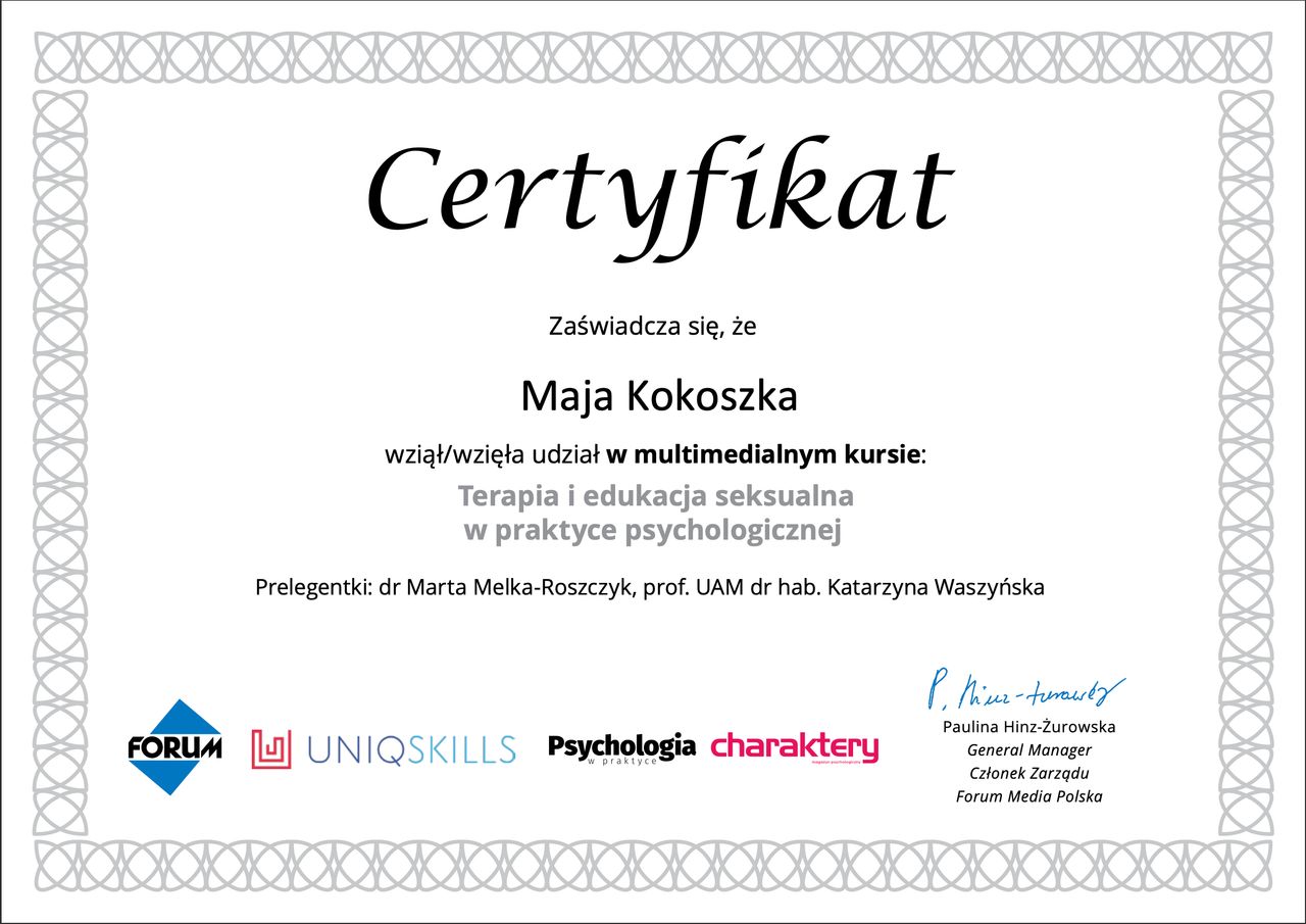 Czy Maja Kokoszka przyjmuje online, bez konieczności pojawiania się w placówce?Tak, Maja Kokoszka oferuje konsultacje online. Wybierz opcję „konsultacja online” przy umawianiu wizyty, a zobaczysz dostępne terminy.