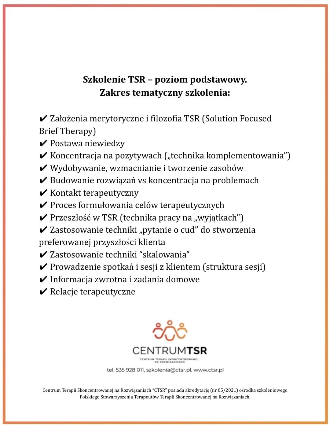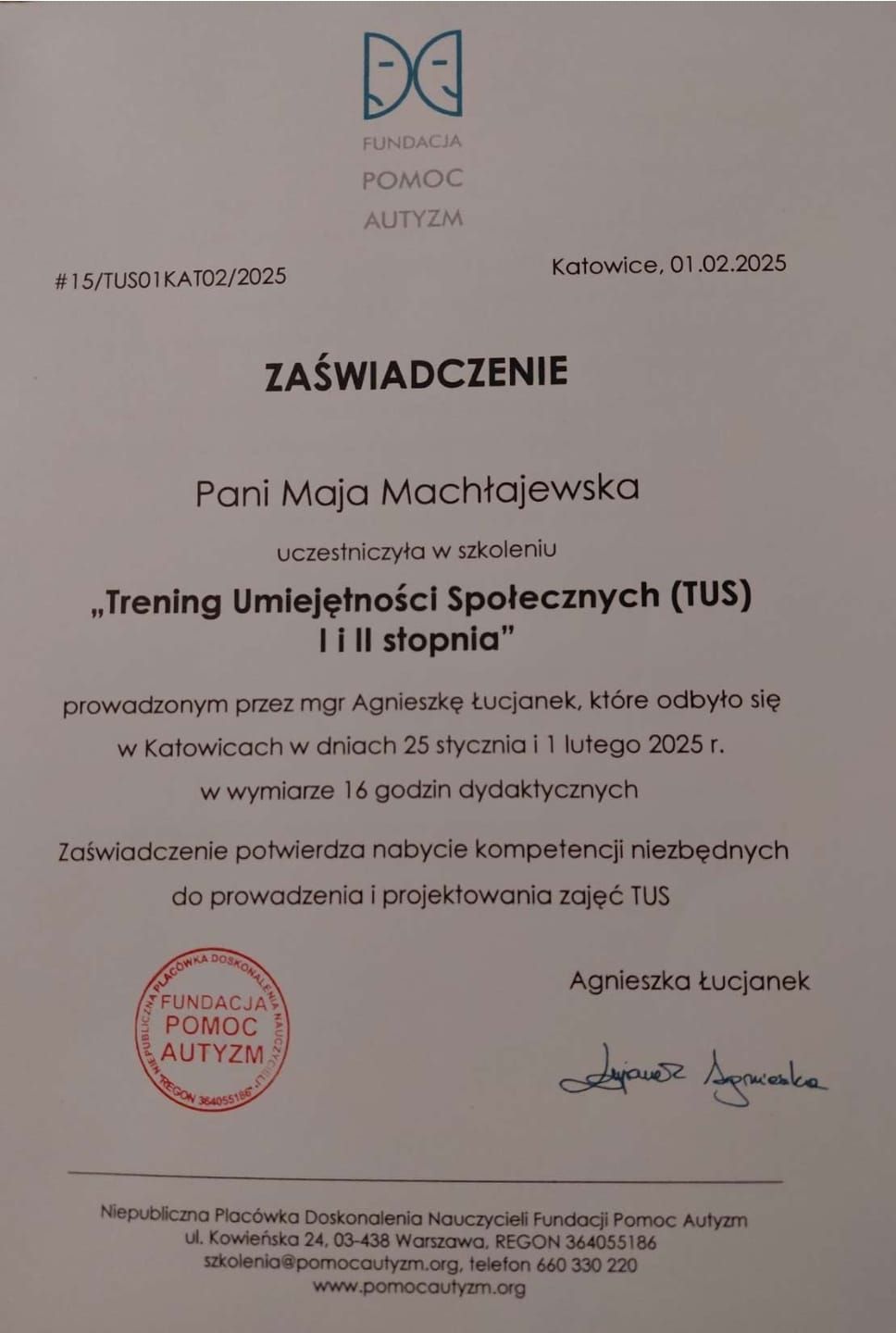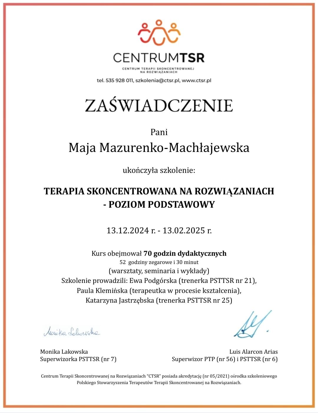 Jestem psycholożką oraz interwentką kryzysową. Tytuł magistra psychologii uzyskałam po pięciu latach studiów na KULu w Lublinie. Ukończyłam także pierwszy stopień terapii skoncentrowanej na rozwiązaniach (TSR) oraz szkolenie trenera umiejętności społecznych. Swoje kwalifikacje stale poszerzam, uczestnicząc w szkoleniach i kursach.