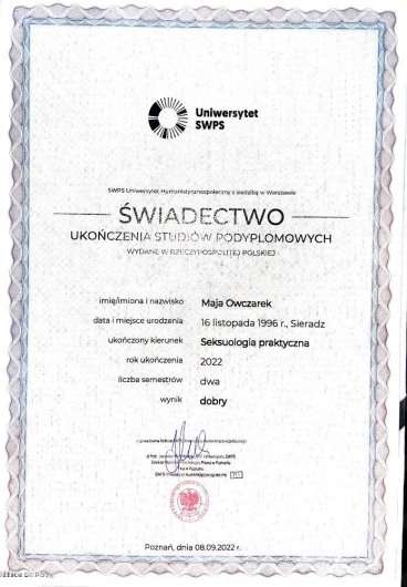 I’m a psychologist and a sexologist. I have a master’s degree in Psychology from University of Łódź and also graduated from postgraduate studies in Practical Sexology at SWPS University in Poznań. I work in a sex-positive approach.