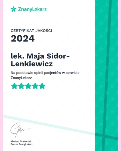 Znam dr Maję od kilku lat, nigdy się nie zawiodłam, celująco kontroluje moją „przypadłość”. Wszystkie kroki leczenia są przemyślane, wytłumaczone. Nigdy nie miałam tak wspaniałego endokrynologa!