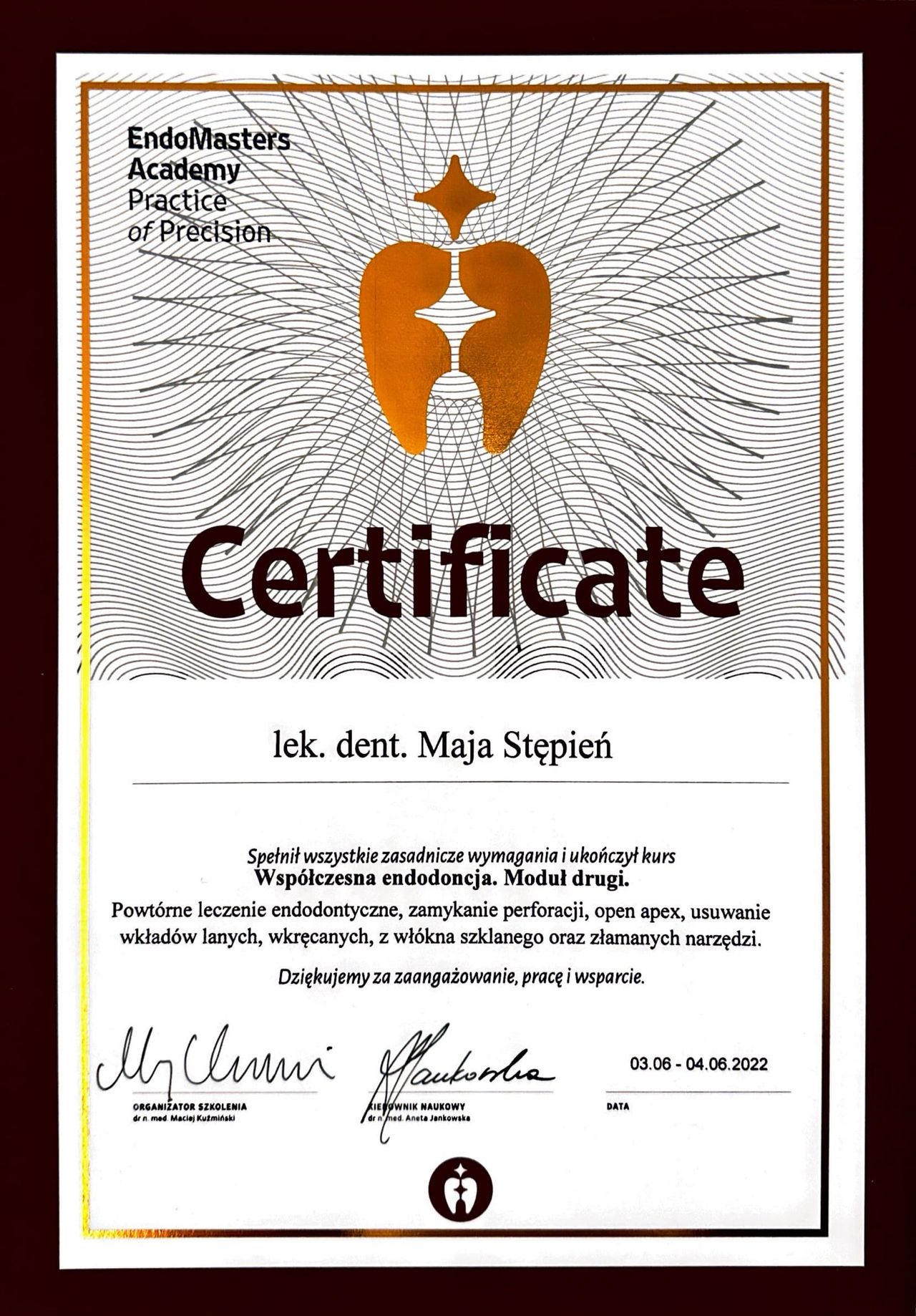 Do Pani doktor trafiłam z polecenia. Okazuje się, że wizyty u stomatologa można polubić. Pani Maja dokładnie tłumaczy cały proces leczenia, a wycena poszczególnych etapów jest znana od początku do końca. Wizyty przebiegają w bardzo miłej i spokojnej atmosferze. Leczenie zębów jest bardzo dokładne i komfortowe dla pacjenta. I do tego zawsze miłe przywitanie z szerokim uśmiechem, oby więcej było takich profesjonalistów. Polecam wszystkim!