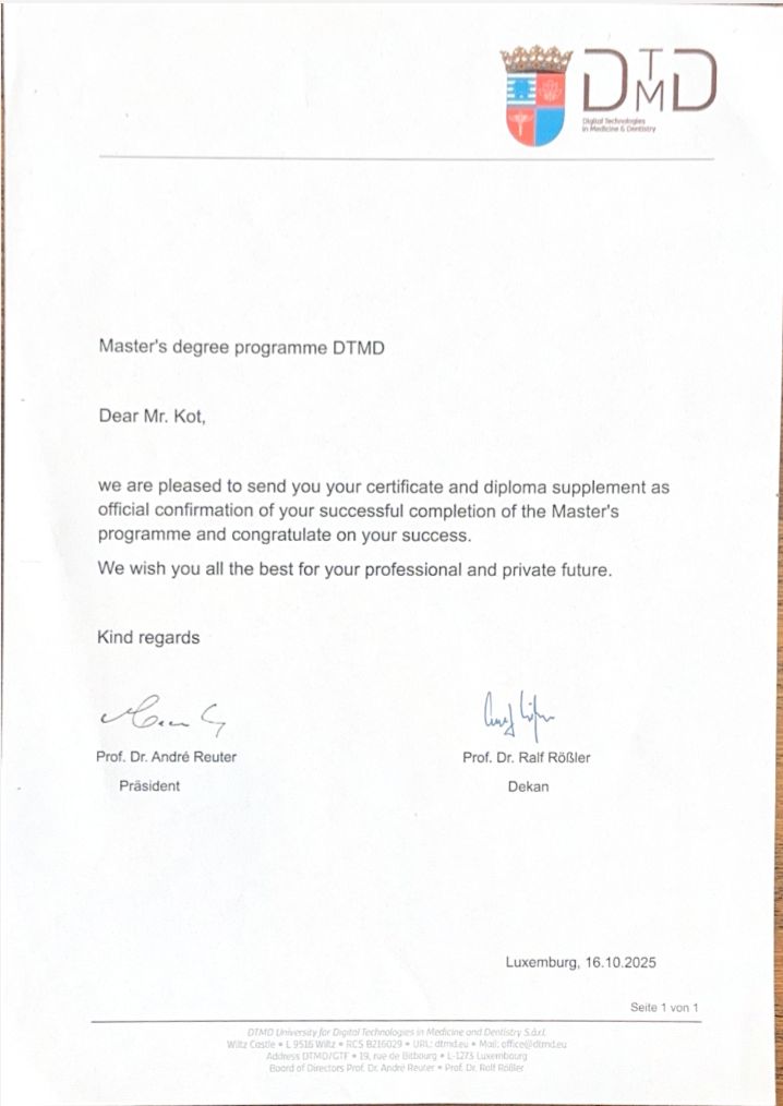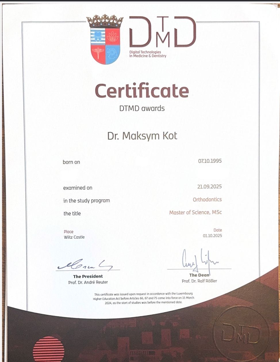 Jestem lekarzem dentystą zajmującym się ortodoncją oraz stomatologią zachowawczą. Ukończyłem Uniwersytet Medyczny im. Piastów Śląskich we Wrocławiu oraz studia Master of Science z ortodoncji w Luksemburgu (Digital Technologies in Medicine & Dentistry).