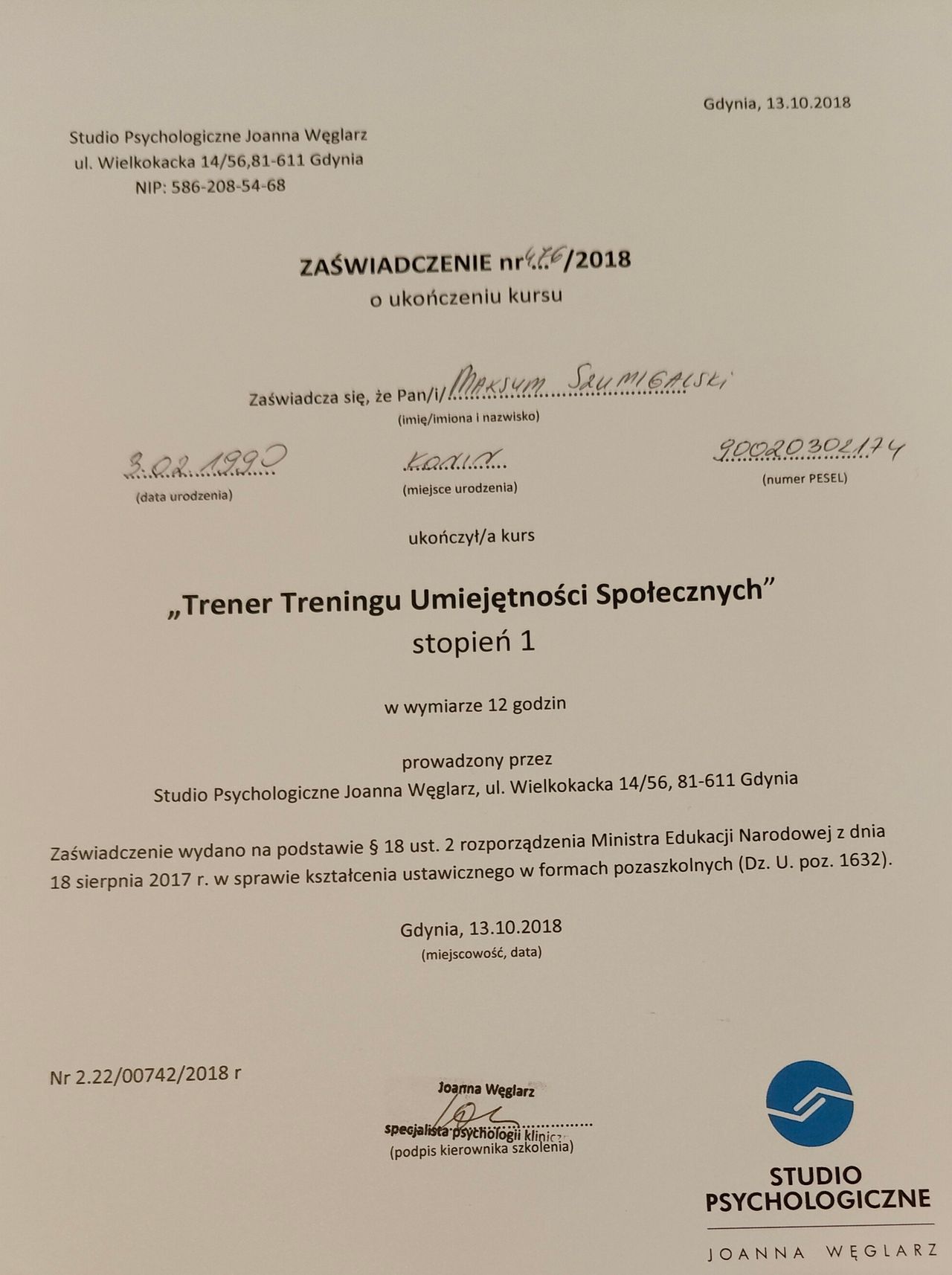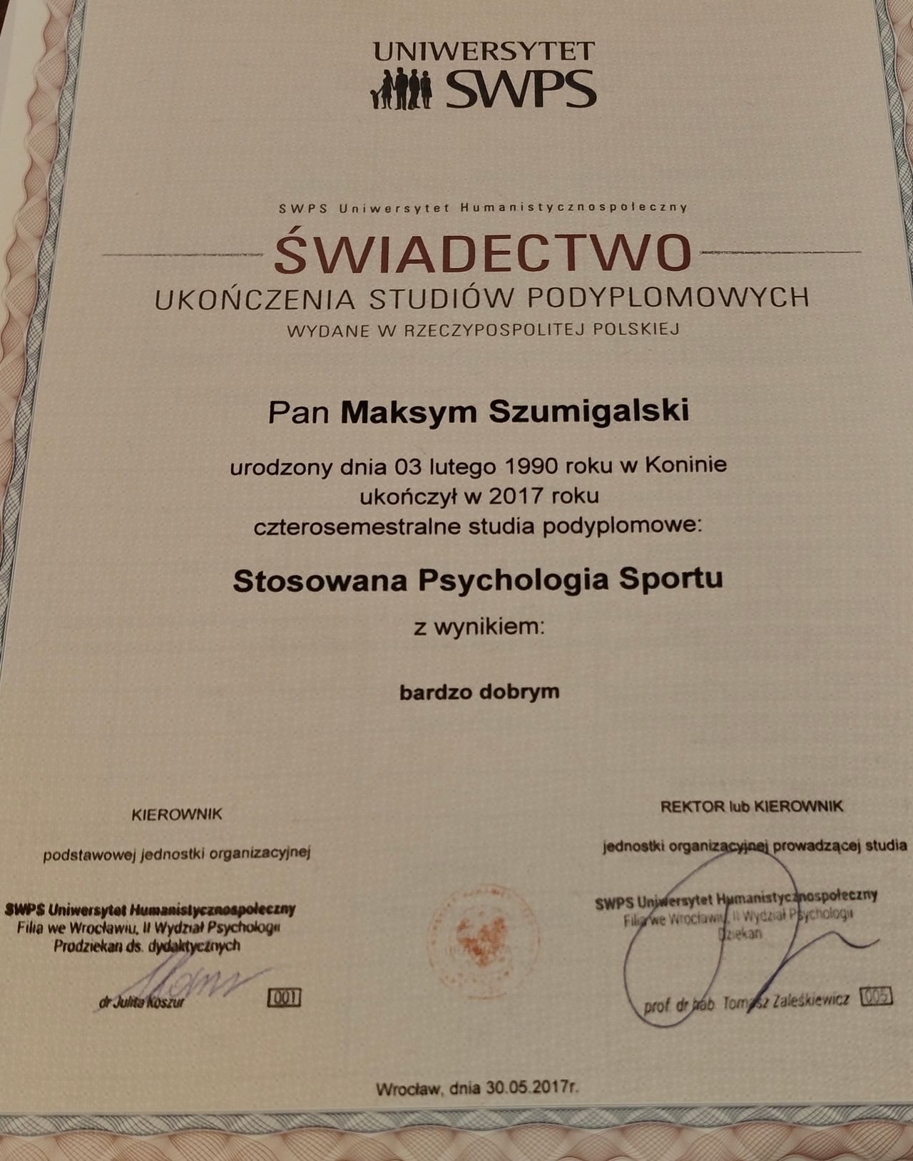 Wykształcenie zdobyłem na Szkole Wyższej Psychologii Społecznej we Wrocławiu. Jestem w trakcie specjalizacji z psychologii klinicznej na Uniwerstytecie Medycznym w Poznaniu.