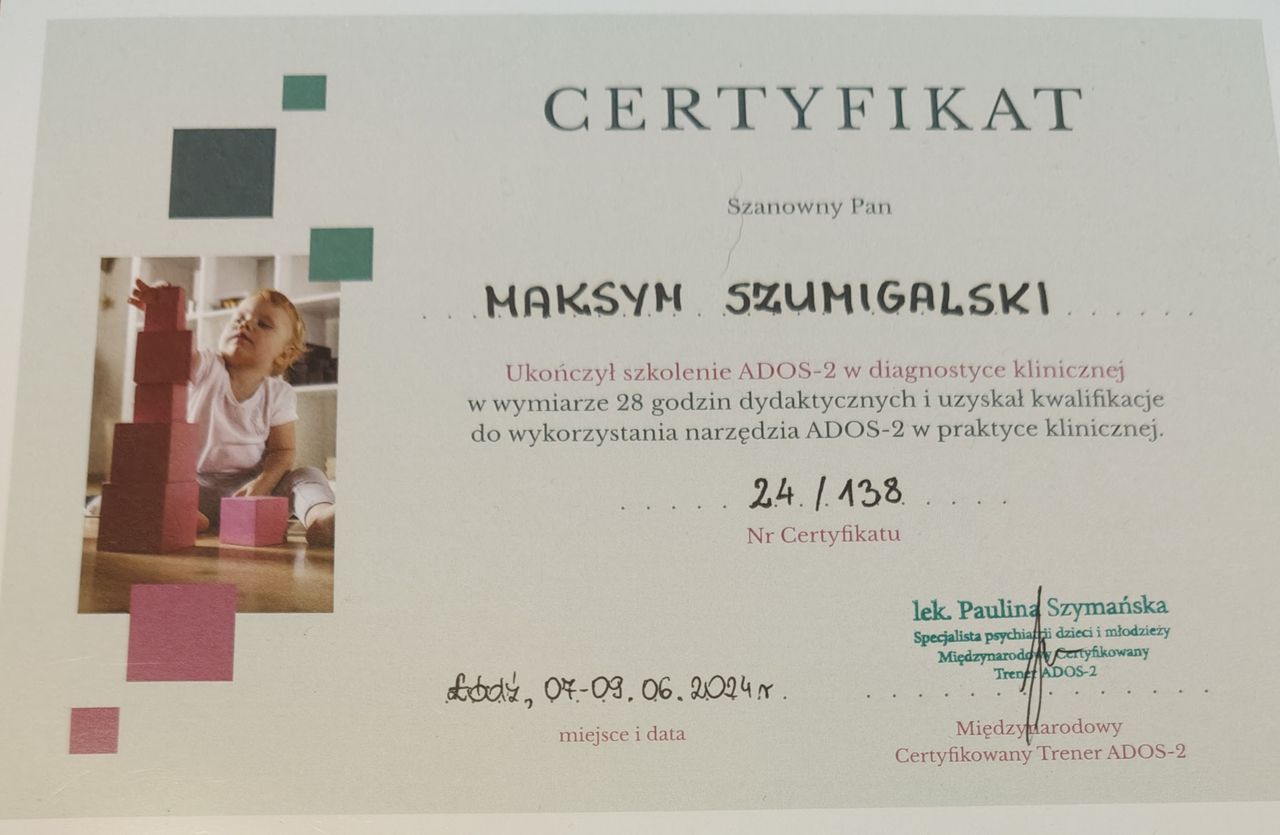 Jestem psychologiem, psychoterapeutą poznawczo-behawioralnym. Posiadam Certyfikat diagnosty ADOS-2 przeznaczonym do diagnozy zaburzeń spektrum autyzmu.