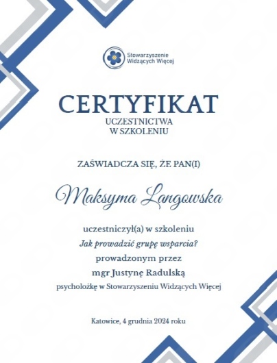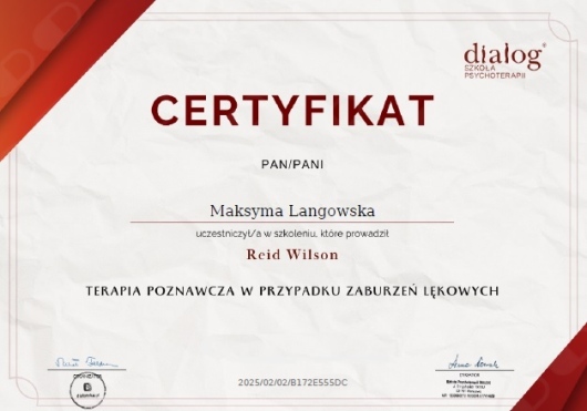Piszę tę opinię już po jakimś czasie od zakończenia terapii i to jak zmieniło się moje życie jest niesamowite. Pracując kilka miesięcy z panią Maksymą udało się zidentyfikować źródło niepokoju i lęku, a następnie krok po kroku podjąć kroki by ułatwić radzenie sobie w trudnych sytuacjach. To wszystko w bardzo miłej, empatycznej i bezpiecznej atmosferze. Pani Maksyma jest profesjonalistką z doświadczeniem. Jest ciepłą osobą z przyjaznym nastawieniem. Jestem bardzo zadowolona z tej współpracy i uzyskanych wyników. Polecam!