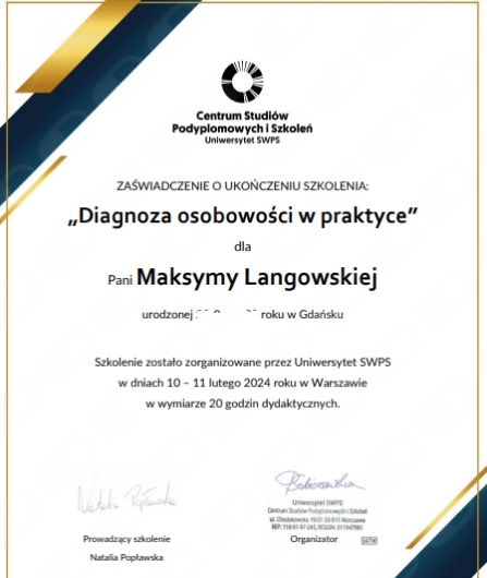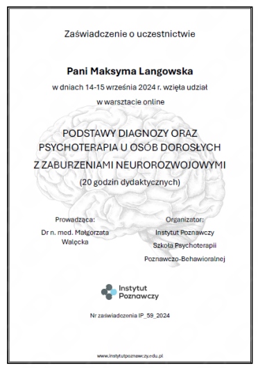 Prywatnie jestem pasjonatką sportu, szczególnie sportów siłowych, crossfitu i boksu. Uważam, że ciało i umysł są ze sobą nierozerwalnie związane, dlatego też interesuję się higieną zdrowego trybu życia i jego wpływem na naszą psychikę. Poza tym kocham zwierzęta, zwłaszcza koty, które towarzyszą mi na co dzień. Interesuję się także literaturą true-crime oraz tematyką kryminalną, które pozwalają mi zgłębiać różnorodne aspekty ludzkich zachowań. Celem zapewnienia jeszcze większego bezpieczeństwa pacjentowi i ochrony skuteczności terapii - swoją pracę poddaję superwizji. Ponadto regularnie się doszkalam, poszerzając swoją wiedzę i rozwijając umiejętności w zakresie terapii poznawczo-behawioralnej, w tym terapii III fali oraz innych podejść, aby jak najlepiej odpowiadać na potrzeby moich pacjentów. W swojej pracy stosuje metody i techniki terapeutyczne, których skuteczność została potwierdzona licznymi badaniami.