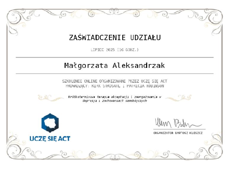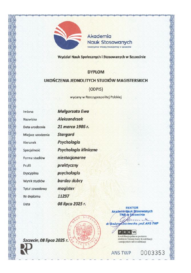 Jestem psycholożką, aktualnie w trakcie szkolenia w nurcie poznawczo-behawioralnym (CBT). Bliskie są mi podejścia trzeciej fali terapii CBT, w szczególności terapia akceptacji i zaangażowania (ACT), a także somatic experiencing i teoria poliwagalna, które wspierają integrację ciała i umysłu w procesie zdrowienia. Ukończyłam liczne kursy z zakresu pracy z traumą, uważności oraz samowspółczucia.