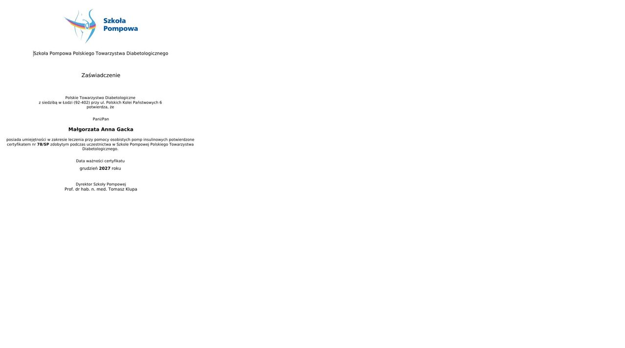 -Szkoła pompowa Polskiego Towarzystwa Diabetologicznego ( certyfikat nr 00078/SP)