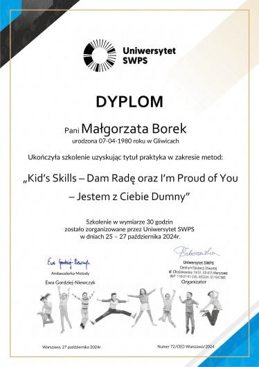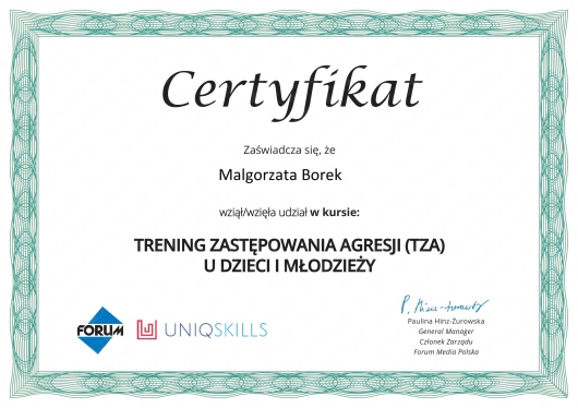 Jestem psychologiem. Ukończyłam jednolite studia magisterskie na SWPS na kierunku psychologia o specjalności klinicznej. Od momentu ukończenia studiów pracuję zawsze z drugim człowiekiem, czy starszym czy młodszym. Od dawien dawna próbuje zrozumieć przyczyny ludzkiego postępowania nie widoczne gołym okiem, właściwie od zawsze mnie to fascynowało. Uważam, że każdy człowiek posiada potencjał i zasoby, które mogą mu pomóc w poradzeniu sobie z trudami życia, czasem jedynie należy mu towarzyszyć w drodzę aby przy odrobinie wsparcia mógł je odkryć i zauważyć. W swojej pracy psychologicznej towarzyszę osobom, które mierzą się z bólem straty, niepewnością czy poczuciem bezsilności. Wierzę, że nawet po trudnych doświadczeniach można odnaleźć spokój i sens, choć droga do tego celu bywa długa i pełna cieni. Sama wiem, jak ważne jest, by w takich chwilach mieć obok kogoś, kto nie ocenia, a rozumie- kto potrafi usłyszeć nie tylko słowa, ale też milczenie. Moim celem jest dawać nadzieję, że cierpienie nie musi definiować całego życia, że z czasem można znowu poczuć, że życie ma smak, barwy i kierunek. Swoje doświadczenie zawodowe zdobywałam za granicą w Niemczech wspierając osoby w różnym przedziale wiekowym, później w Polsce w ośrodku leczenia uzależnień, a obecnie w ośrodku pieczy zastępczej. Ciągle staram się rozwijać swój warsztat pracy, poprzez uczestnictwo w różnych szkoleniach m.in organizowanych przez Dolnośląskie Centrum Psychoterapii, Szkołę psychoterapii Dialog, Uniwersytet SWPS, oraz na konferencjach poświęconych tematyce psychologicznej i terapeutycznej. Bliskie są mi nurty : behawioralno- poznawczy, TSR, Mindfulness. Obecnie zgłębiam swoją wiedzę na podyplomowych studiach z Psychotraumatologii, po to by lepiej oraz skuteczniej móc pomagać osobom dotkniętym przez różne traumatyczne, trudne, wydarzenia życiowe, ponadto jestem certyfikowanym trenerem TUS- I Stopnia, Praktykiem metody Kids and skills and Im proud of you. Na co dzień pracuję z młodzieżą jak i osobami starszymi. W swojej pracy kieruję się Kodeksem Etyczno -zawodowym Psychologa. Zapraszam serdecznie i pozdrawiam.