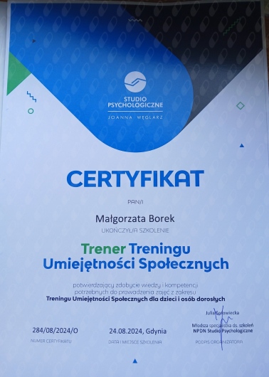 Jaki jest zakres porad oferowanych przez Małgorzata Borek?Małgorzata Borek to psycholog. Na podstawie swojego doświadczenia i wykształcenia Małgorzata Borek oferuje usługi takie jak: Konsultacja psychologiczna, poradnictwo psychologiczne, interwencja kryzysowa, psychoedukacja, relaksacja, Konsultacja psychologiczna online.